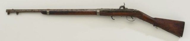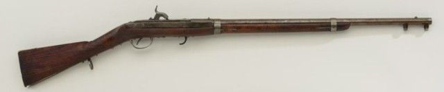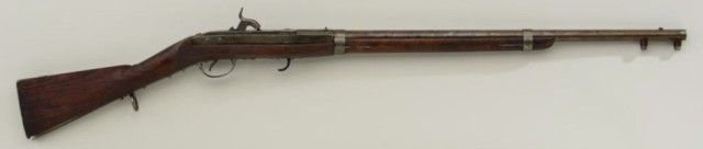 Model 1833 Hall-North U.S. breech loading percussion carbine, .52 caliber smoothbore, 26-3/16” barrel with bayonet lugs mounted under muzzle (no bayonet or ramrod), wood stock, sling ring mounted at end of bottomtrigger tang and implement compartment on bottom of butt area. This gun is in overall fair to good condition showing some well-done restoration to the wood beneath the receiver and replacement of the breech release“hook”; metal surfaces show scattered spots of erosion on the barrel and moderate pitting adjacent to the firing areas although inspector’s initials “N.W.P.” still clearly visible; scattered pitting elsewhereincluding the butt plate; accessories door at bottom of butt stock is loose; action good, bore dark; wood stock overall good with aforementioned restoration; hard-to-find in any condition given there were only about7100 of this model manufactured between 1834-39. Est.: $700-$1,400.