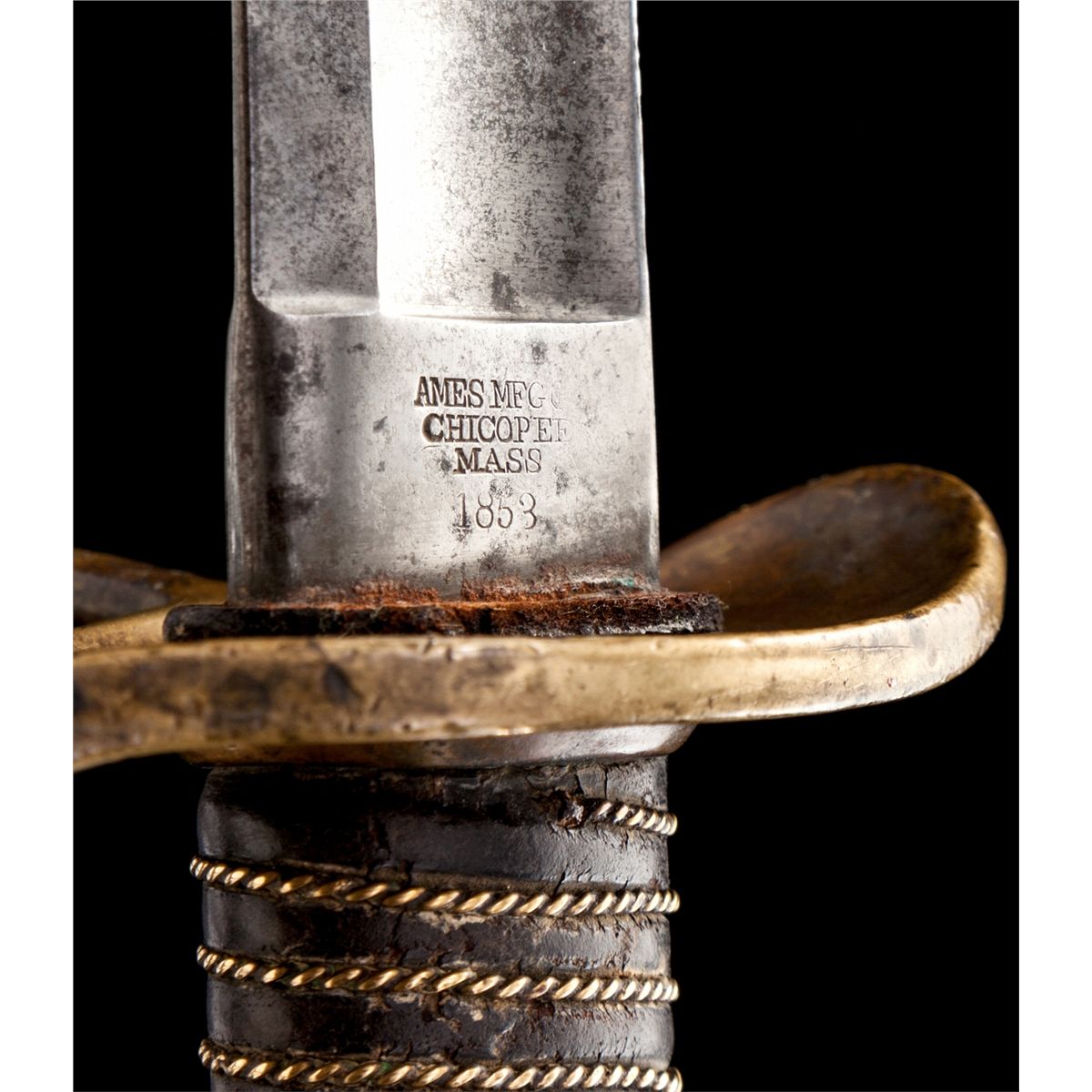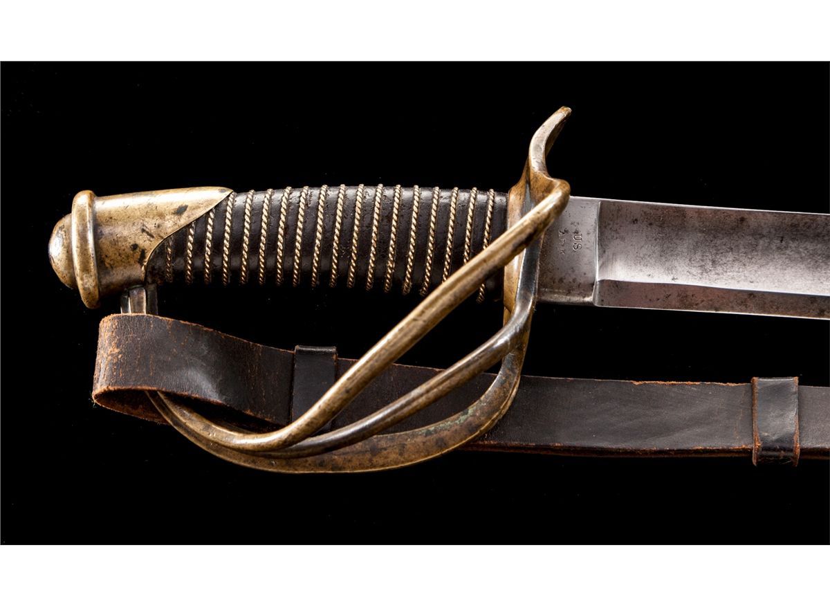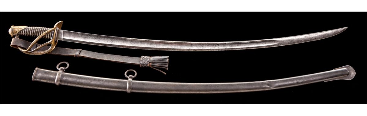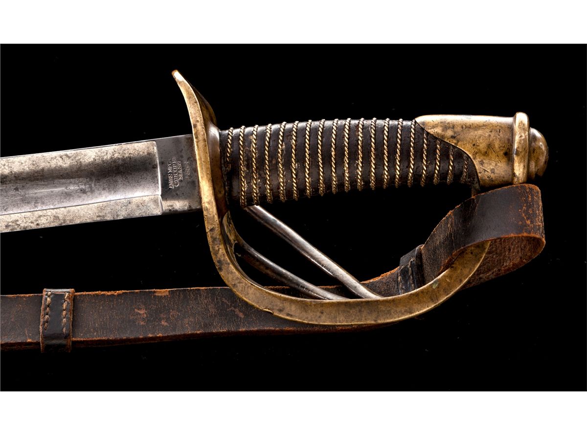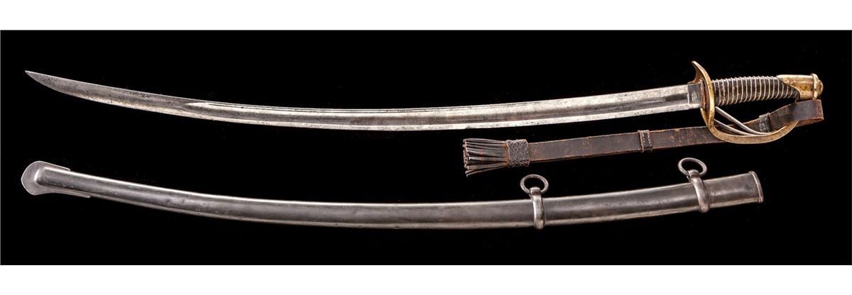 Model 1840 U.S. Cavalry Saber, with leather sword knot, 41'' overall with 36'' blade marked ''Ames Mfg'd Chicopee Mass'', and dated 1853; obverse marked ''U.S./A.D.K.'', making this sword correct for either Confederate or Northern use. Condition is very good with moderate carbon spotting to blade. Tight two-stand brass wrap over leather handle. Leather washer is present. Two-ring iron scabbard with one small ding 2/3s down. Sword knot is excellent. Est.: $1,000-$1,500.