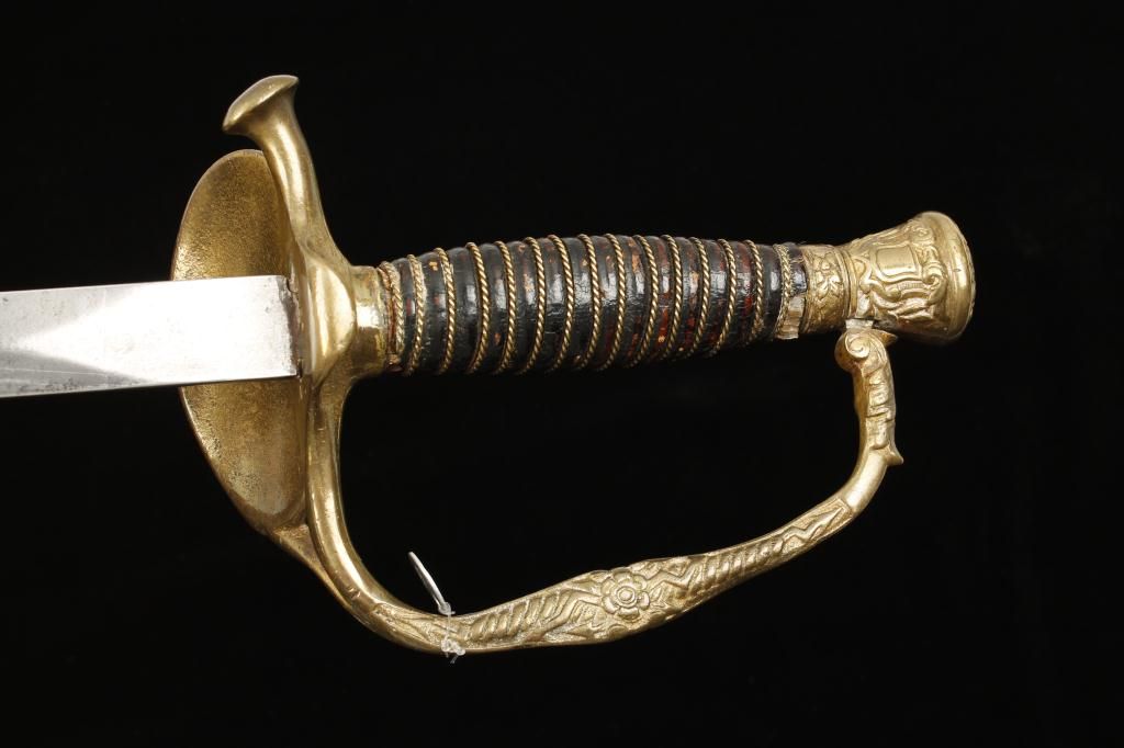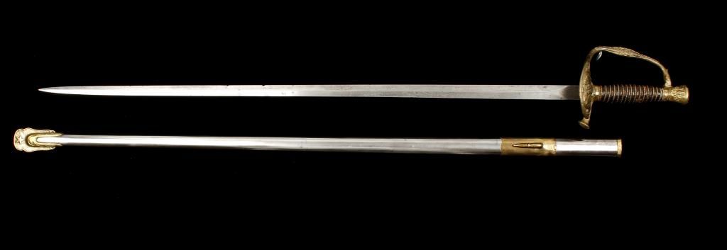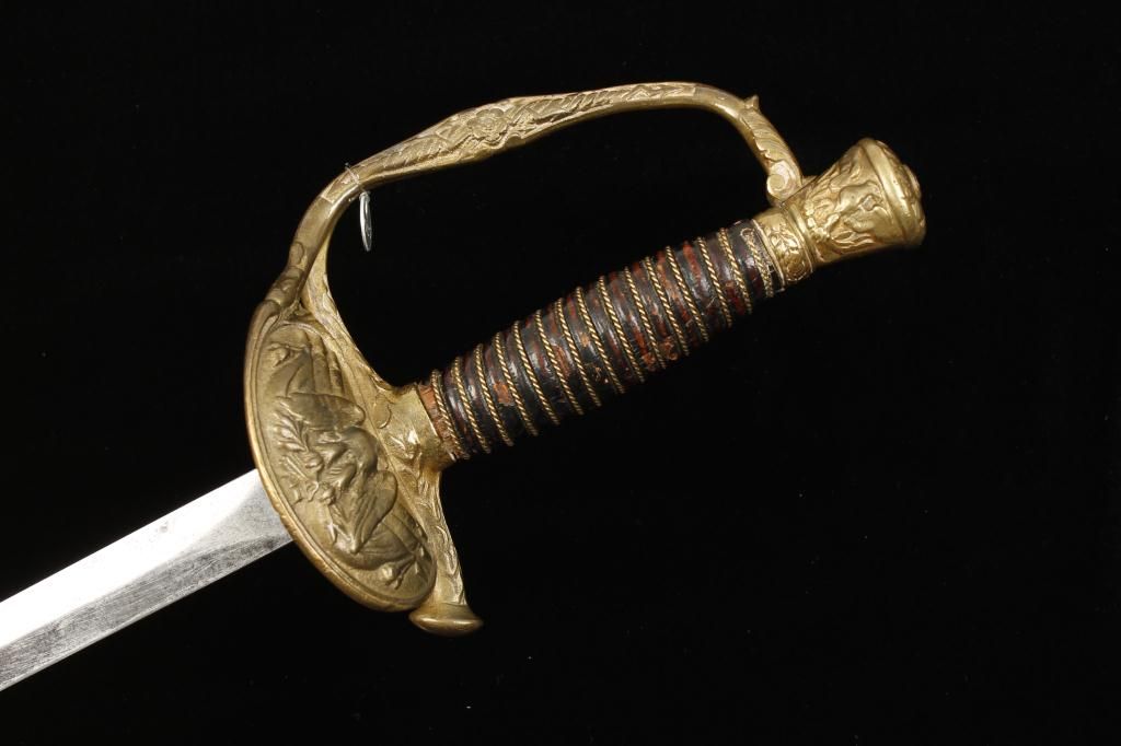 Model 1840 non-commissioned officers sword with blade etched showing Eagle and US by William Reed and sons of Boston Massachusetts. This sword retains the original scabbard and is overall in goodcondition showing some light cleaning and normal aging. The grip is good with some small losses of leather in a tight wire wrap. The etching on the blade is slightly light. Est.: $200-$400