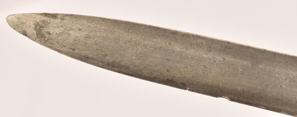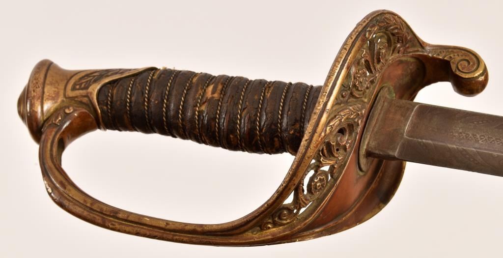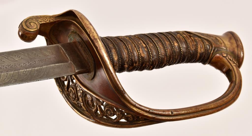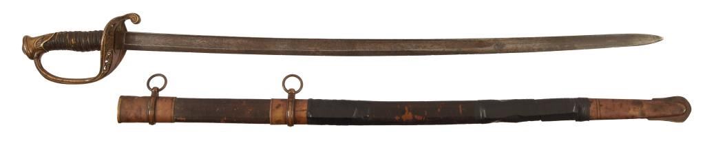 Model 1852 Officer's Sword with etched blade, brass hilt and guard, wire wrapped leather grip, leather scabbard with brass hangers and tip, no visible maker's mark on sword. Scabbard throat marked "ROBY& CO./ W.CHELMSFORD, MASS." Circa mid-19th century. Blade has smooth dark patina, dull patinated brass overall, good grip. Fragile scabbard, with leather areas of scabbard heavily reinforced with tape. 31.5" blade, 37" overall length.