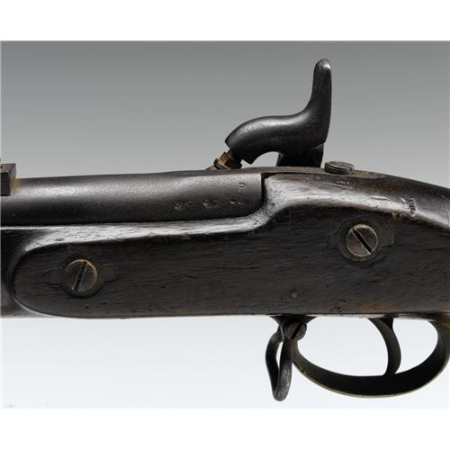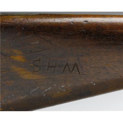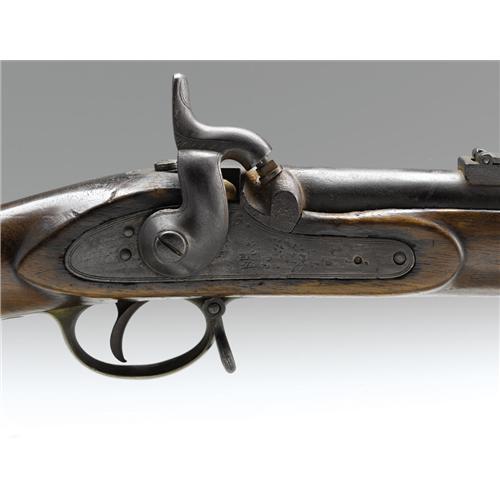 <B>Model 1853 3-Band Enfield Rifled Musket.</B></I> 55" overall length with 39" barrel, .577 caliber, "BARNET LONDON" stamped on lockplate, 3 inspector's marks on barrel, brass buttplate, trigger guard and nose cap. Complete with original ramrod. Owner's initials, "WHS" (or "SAM"?), carved on butt. Light rusting and pitting on all ferrous metal parts, however the gun's action still works. This weapon has "seen the elephant". Good condition. A classic Civil War era musket made in England and used widely by both North and South. <BR><BR><B>Kent Wall's Report:</B></I> <BR>This Enfield rifle pattern 1853 is an example of the type of firearm manufactured in England and perhaps saw service in America during the Civil War. <BR>This rifle has three iron, adjustable barrel bands, .577 caliber and is 55" in length, with a 39" barrel. <BR>The lockplate is marked "Barnet" over "London" and exhibits dings and scratches with some pitting. <BR>The barrel is dark with pitting and light rust, especially around the bolster. There are three proofmarks and a "P" stamped on the barrel. <BR>The buttplate, trigger guard, and nose cap are brass. <BR>The long range rear sight and front sight are present. <BR>There is a ramrod present and there are no markings. <BR>The stock exhibits numerous scratches and dings. "SAM" (or "WHS") is carved on the butt. On the left side near the escutcheon is stamped "J. C." in small letters. <BR>Overall Condition: Fair.<BR><BR><b>Shipping:</b> Large Collectibles (<a target="_blank" href="http://www.heritageauctions.com/common/shipping.php">view shipping information</a>)