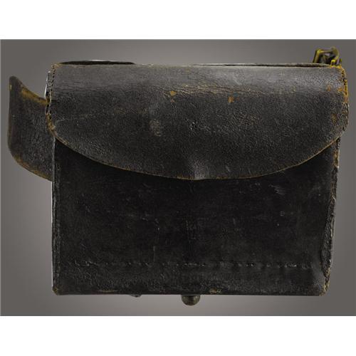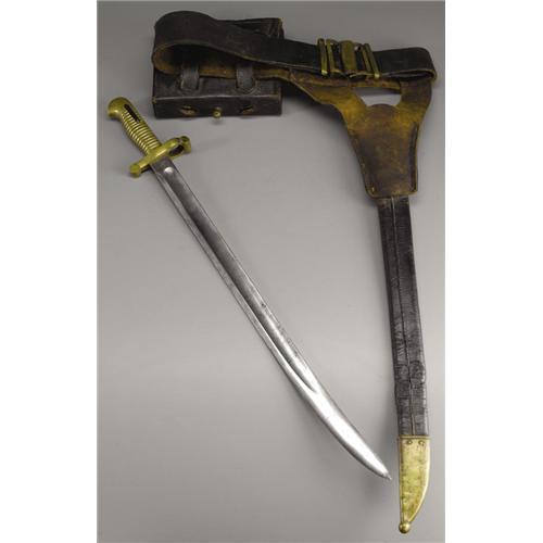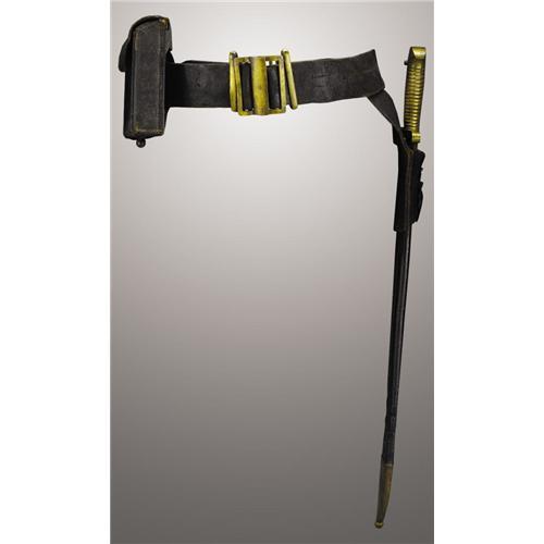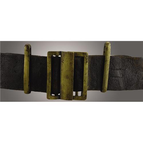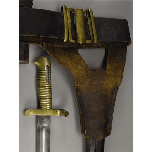 <B>Model 1855 Rifleman's Belt and Bayonet Rig.</B></I> A complete M-1855 rifleman's rig including an 1855 saber bayonet with brass ribbed handle, 21.75” bright blade; 26.5” overall; marked with an “<I>SP</B></I>” on the flat of the handle; release mechanism in working condition; tip of blade slightly bent; else, in fine condition. Complete with: leather scabbard with brass throat and tip and complete frog and straps with light crazing, else fine; M-1855 rifleman's belt, 33.5” long, 2” wide, with brass buckle and keepers slightly dry but pliable in near fine condition; and an 1855 leather cartridge box, with trimmed flap and the inner box removed, in very good condition. The rig is in beautiful condition overall, showing very little hard wear. The consignor indicates that this rig came from an old home in Georgia and was likely used by a Confederate soldier. The modified cartridge box is certainly indicative of Confederate field-modified equipment. A great rig which will display well.<BR><BR><b>Shipping:</b> Miscellaneous Collectibles, Larg (<a target="_blank" href="http://www.heritageauctions.com/common/shipping.php">view shipping information</a>)
