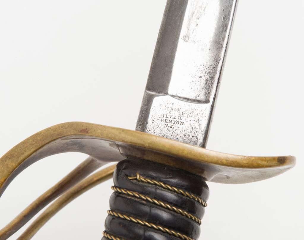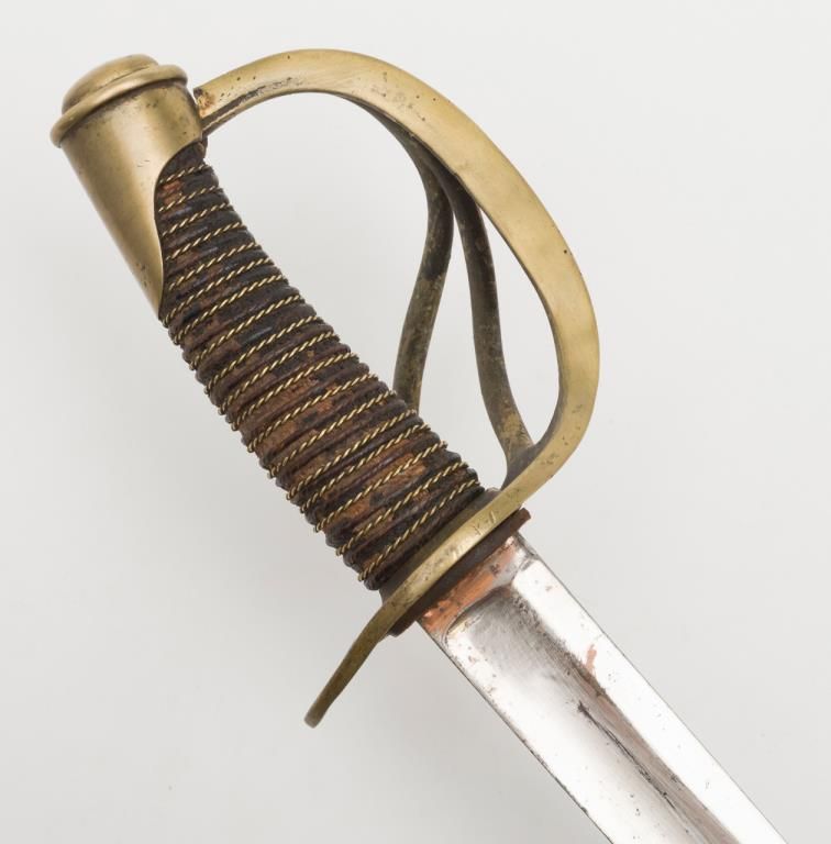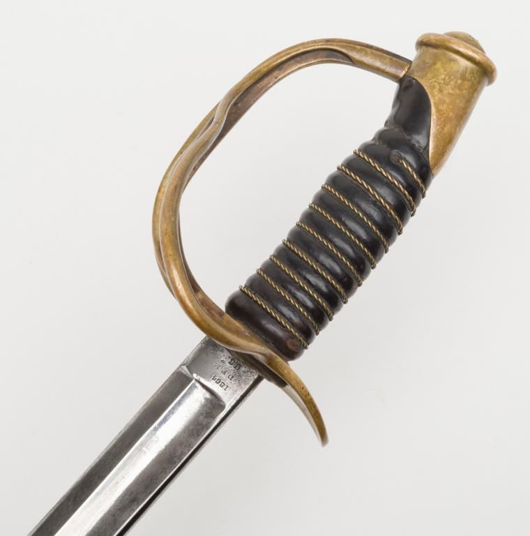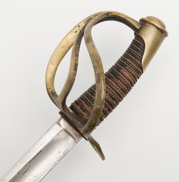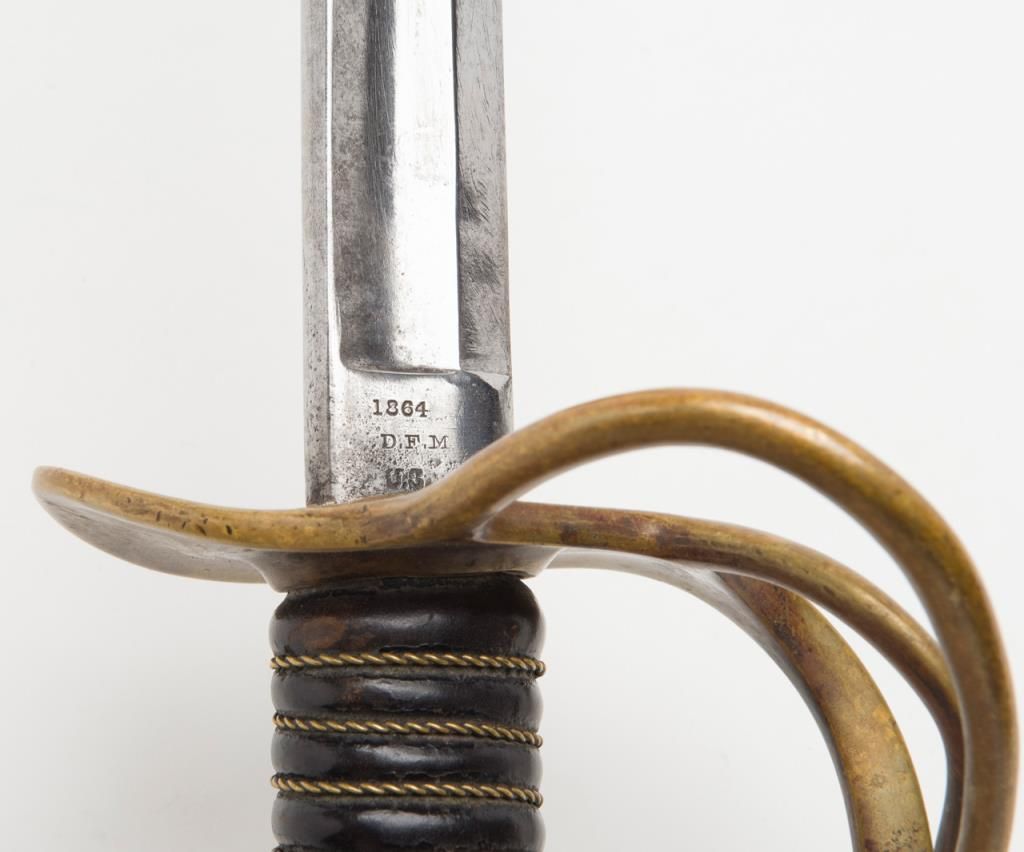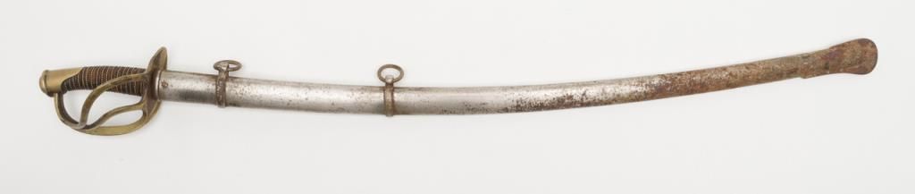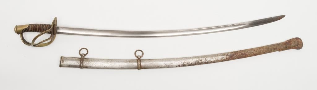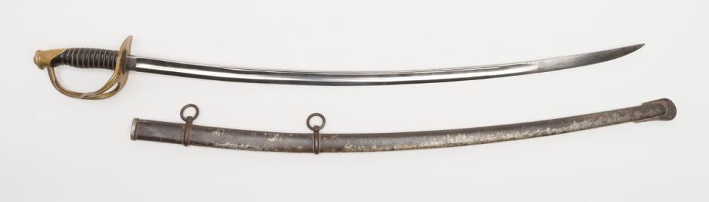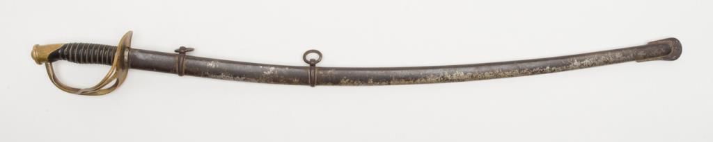Model 1860 Cavalry Officer’s saber and metal scabbard with hanging rings, blade by Emerson & Silver, dated 1864 and inspected “D.F.M.”; plain blade, wire wrapped leather grip, brass guard and pommel, all in good to very good overallcondition; the scabbard shows approx. 50% nickel finish with balance gone to a dark patina. Est.: $250-$500