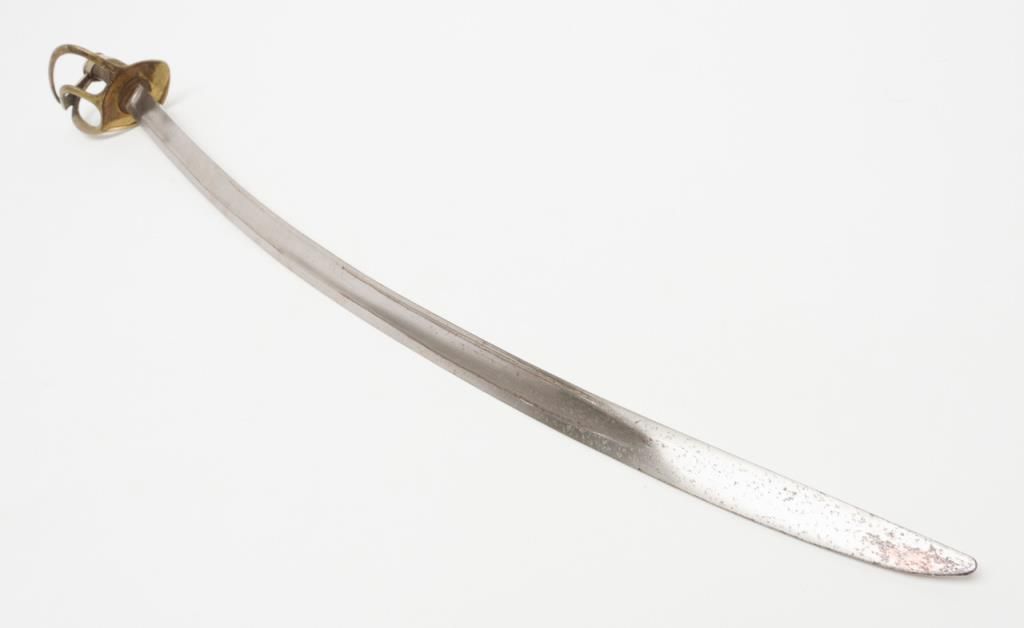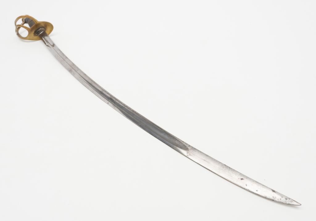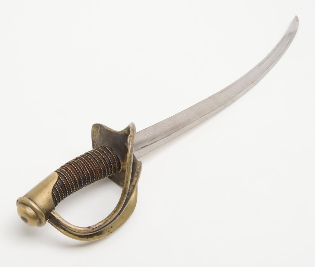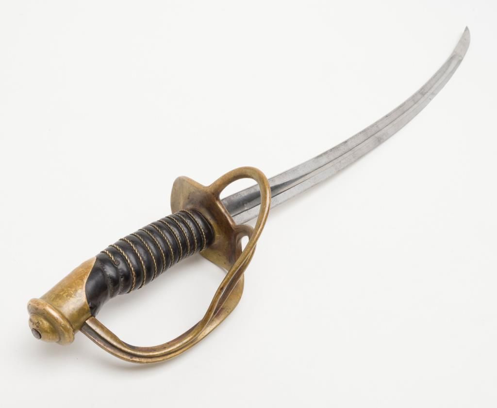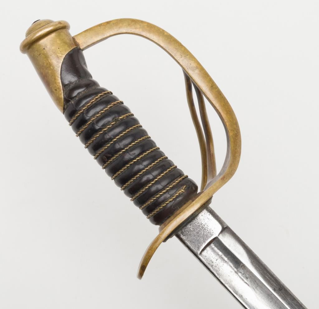 Model 1860 Cavalry Officer’s saber and metal scabbard with hanging rings, blade by Emerson & Silver, dated 1864 and inspected “D.F.M.”; plain blade, wire wrapped leather grip, brass guard and pommel, all in good to very good overallcondition; the scabbard shows approx. 50% nickel finish with balance gone to a dark patina. Est.: $250-$500