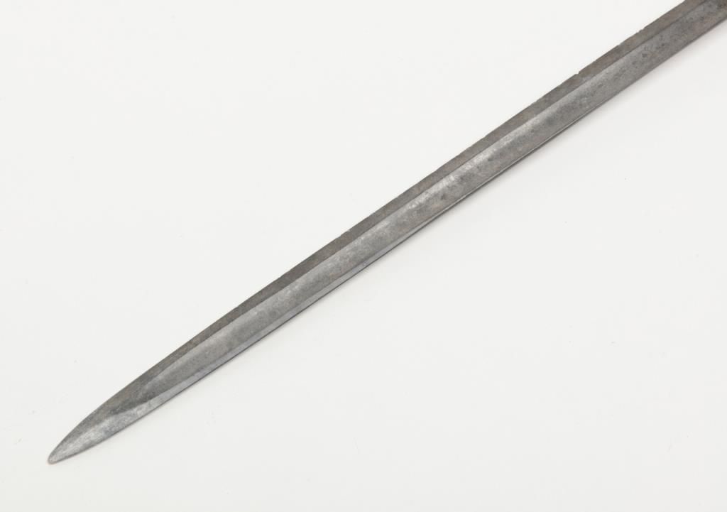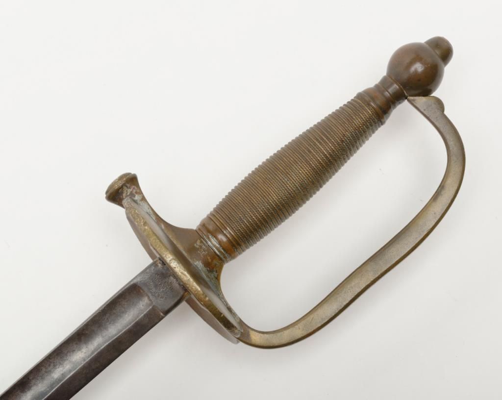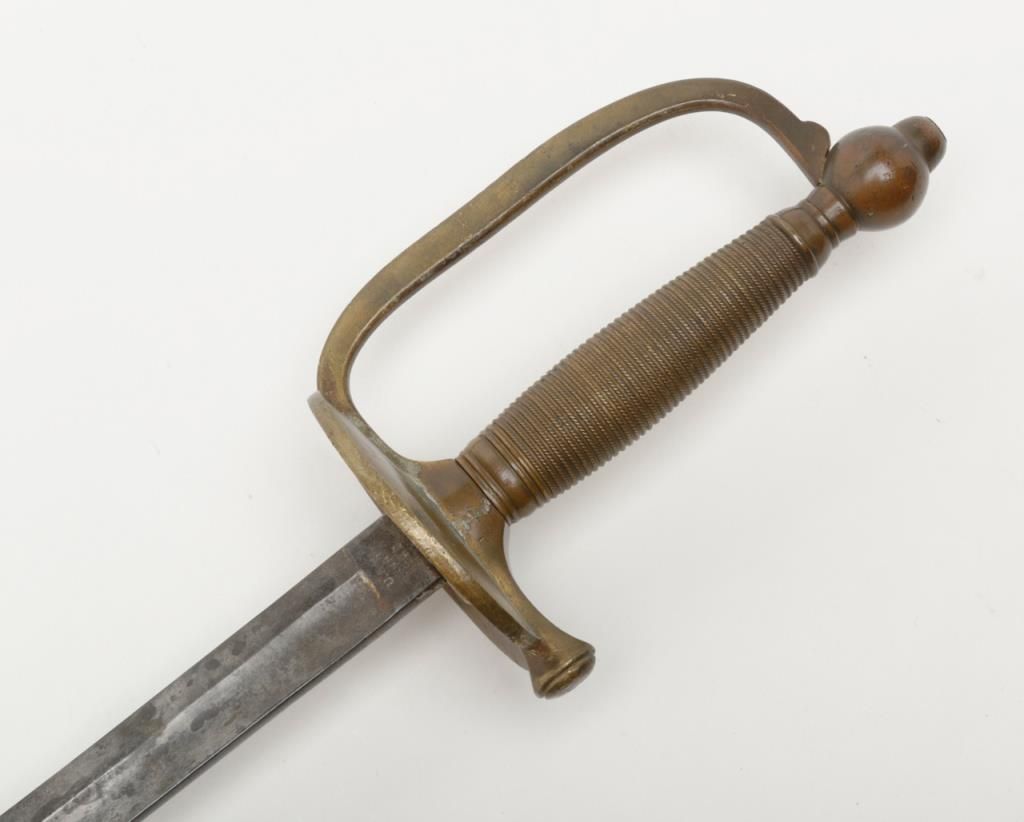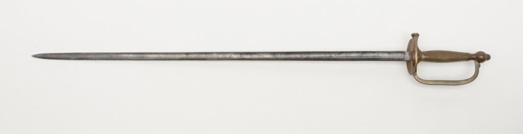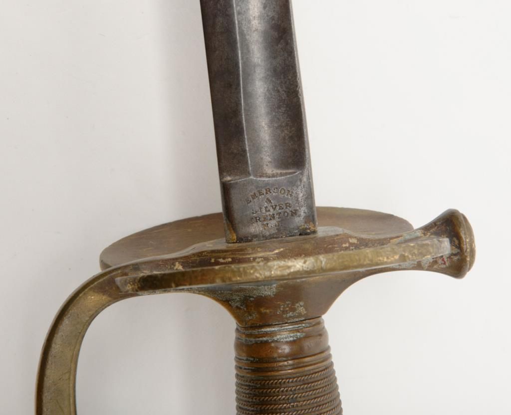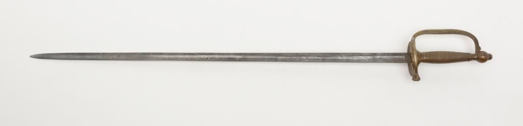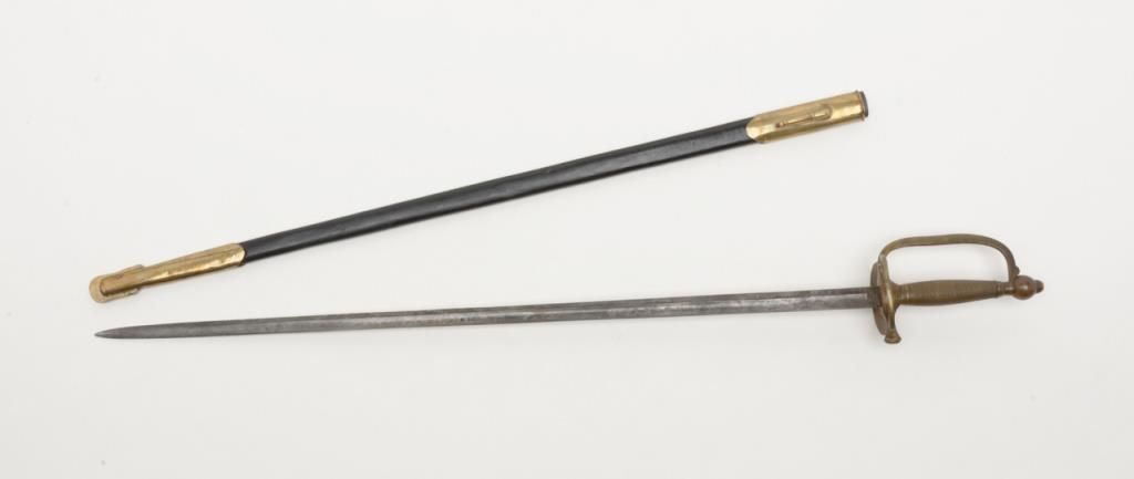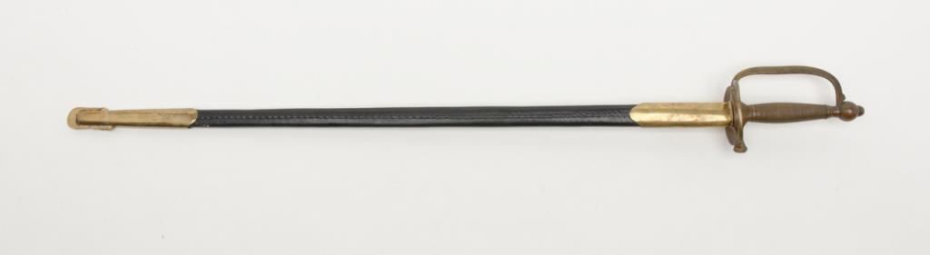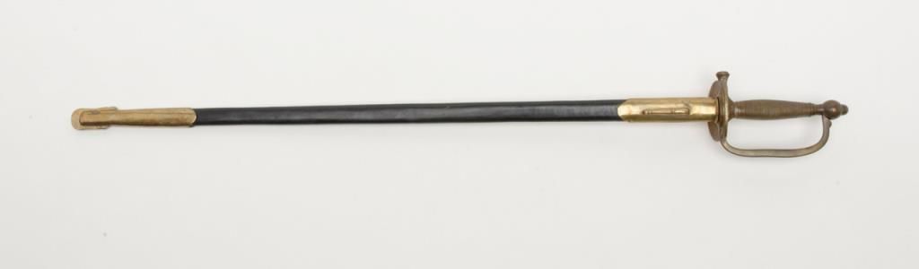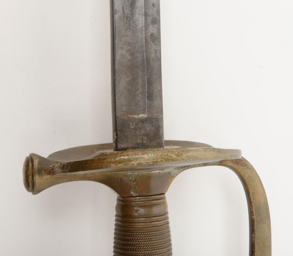 Model 1860 NCO’s sword and leather scabbard with brass drag and throat in very good condition; blade is by Emerson and Silver, dated 1862 and inspected by G.G.S.; brass grip and guard show dark patina with D.F.H. inspector’s mark; scabbard throat and drag have been cleaned and leather body is an excellent reproduction. Est.: $200-$400