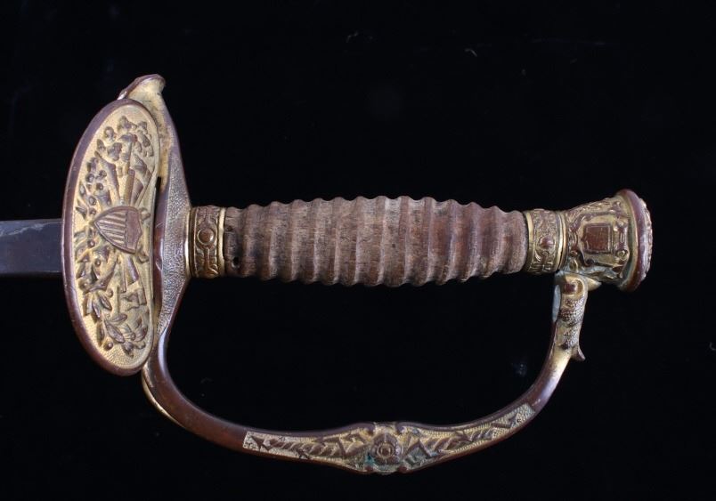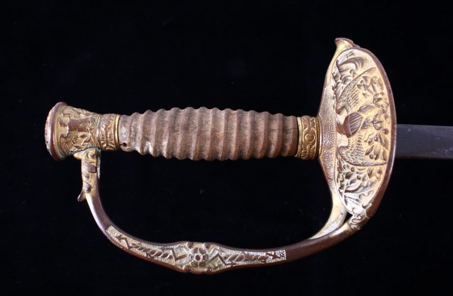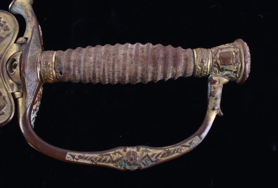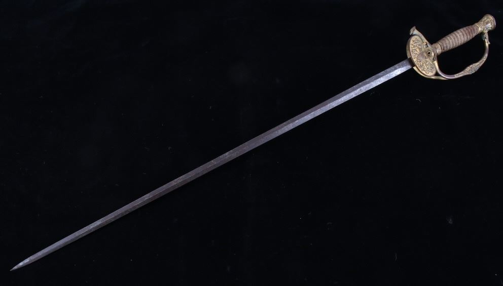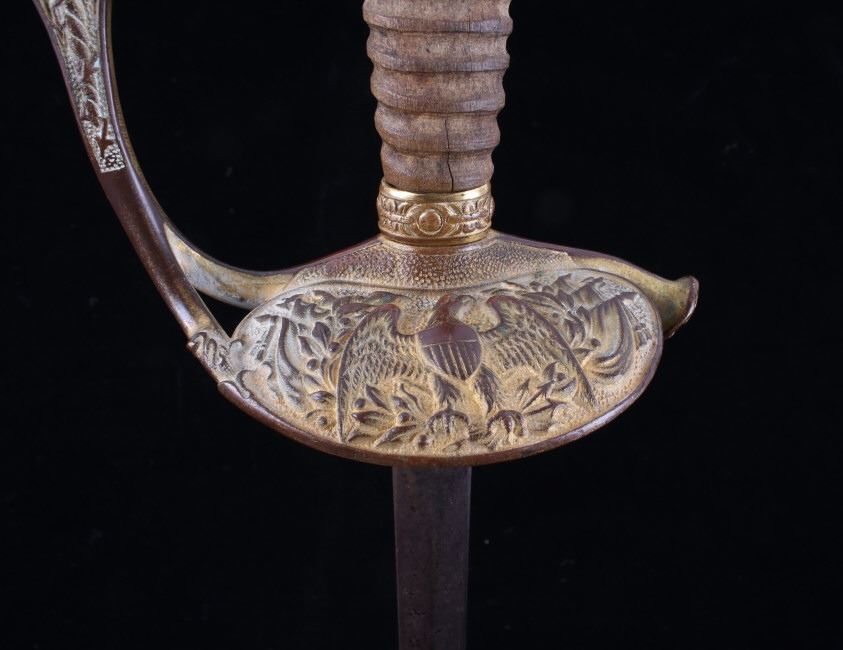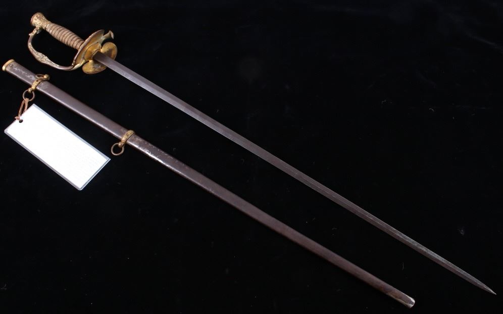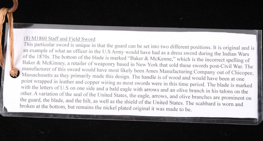 Featured in this lot we have a Model 1860 ornamental presentation Staff and Field sword originating from the 1870's. This unique sword was used as a U.S. Army Officers dress sword from the Indian Wars in the 1870's. The sword was sold by Baker & McKinney which was a weapon retailer located in New York that sold Model 1860 swords after the civil war. The blade displays a double edged construction and is marked "Baker & McKenne" with intricate embossed designs. The guard shows a unique construction with a folding side and designs showing shield and olive branches. The grip shows a turned wooden handle with a spiraling design. The pommel displays wonderful shield and eagle designs. The piece comes with a metal sheath with brass colored accents. The piece shows a paper tag with information on the sword. The sword shows good condition overall with some light wear due to age. The piece measures 35 1/2" long with the blade measuring 29" long.