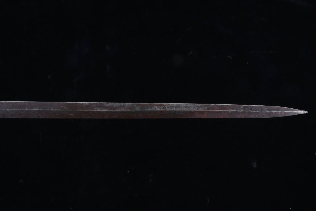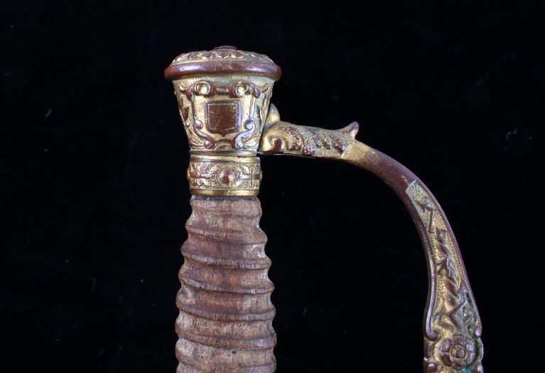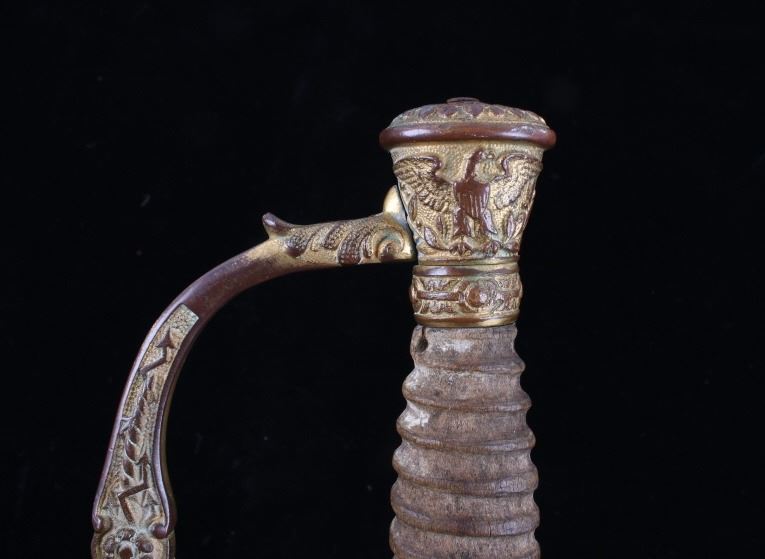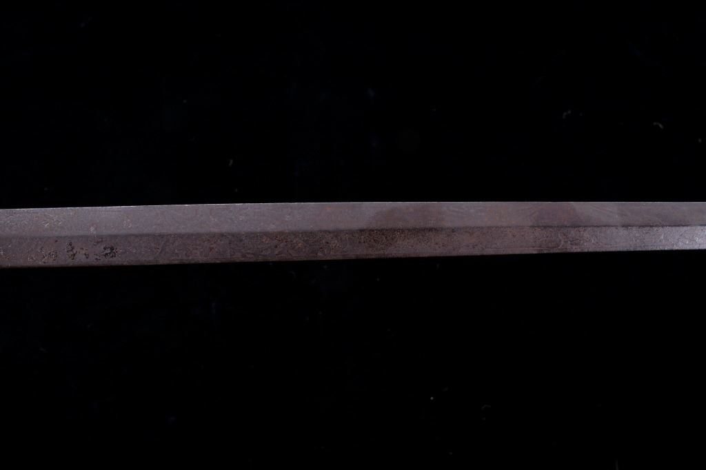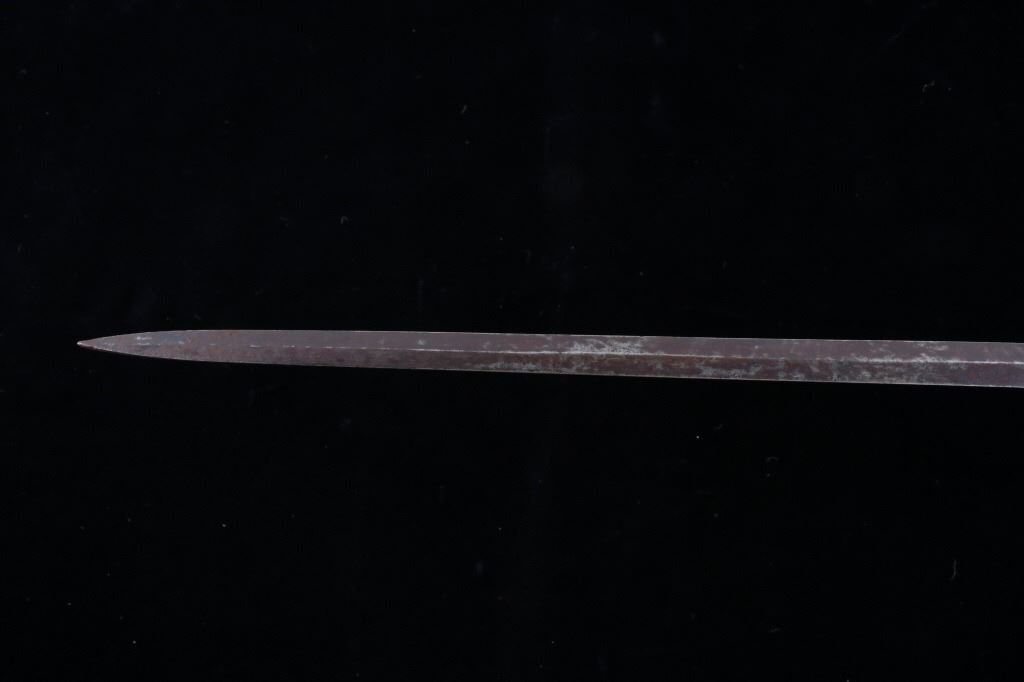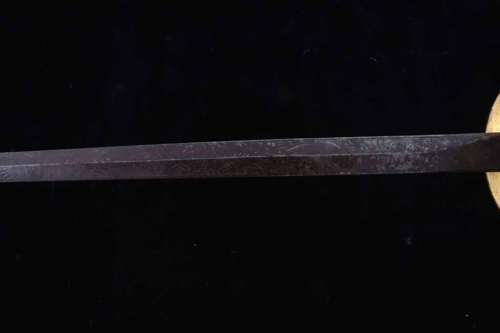 Featured in this lot we have a Model 1860 ornamental presentation Staff and Field sword originating from the 1870's. This unique sword was used as a U.S. Army Officers dress sword from the Indian Wars in the 1870's. The sword was sold by Baker & McKinney which was a weapon retailer located in New York that sold Model 1860 swords after the civil war. The blade displays a double edged construction and is marked "Baker & McKenne" with intricate embossed designs. The guard shows a unique construction with a folding side and designs showing shield and olive branches. The grip shows a turned wooden handle with a spiraling design. The pommel displays wonderful shield and eagle designs. The piece comes with a metal sheath with brass colored accents. The piece shows a paper tag with information on the sword. The sword shows good condition overall with some light wear due to age. The piece measures 35 1/2" long with the blade measuring 29" long.