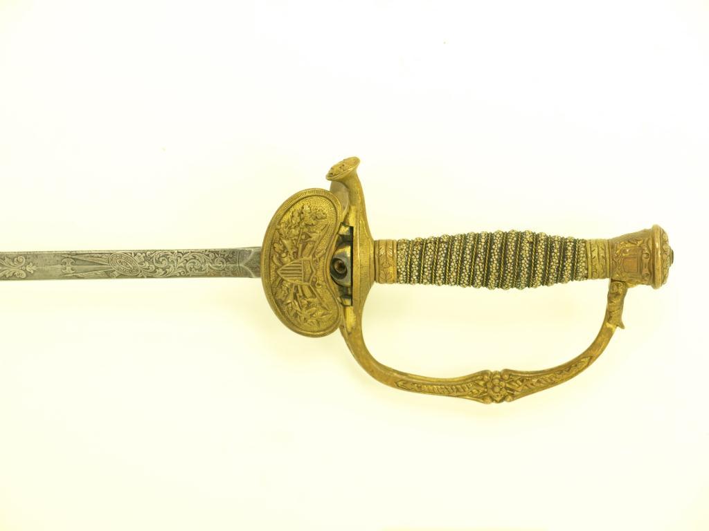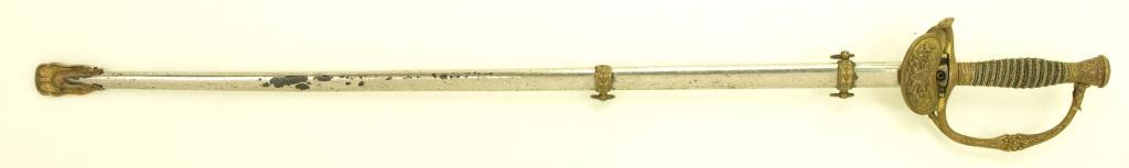 marked The M.C. Lilley & Co. to ricasso, etched military motif to blade. US on right and E. Pluribus Unum under eagle on left. Grip shark skin wire wrapped, rear counter guard decorated in shield and arms, front guard in eagle motif. Original scabbard nickel, top mount double rings, middle single ring, fitted with brass drag. Blade shows pleasing silver gray patina, light scattered erosion toward end, rear hinged guard won't stay in place.