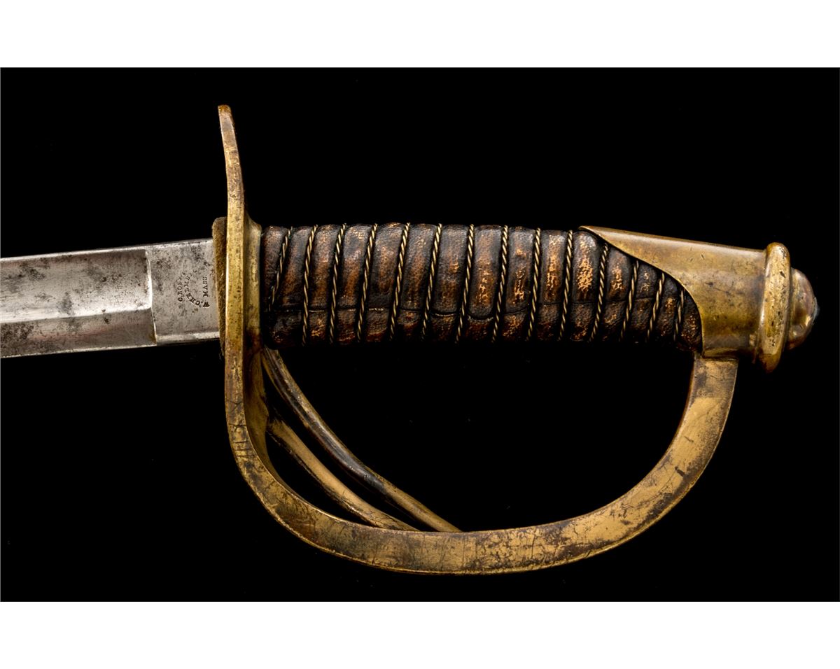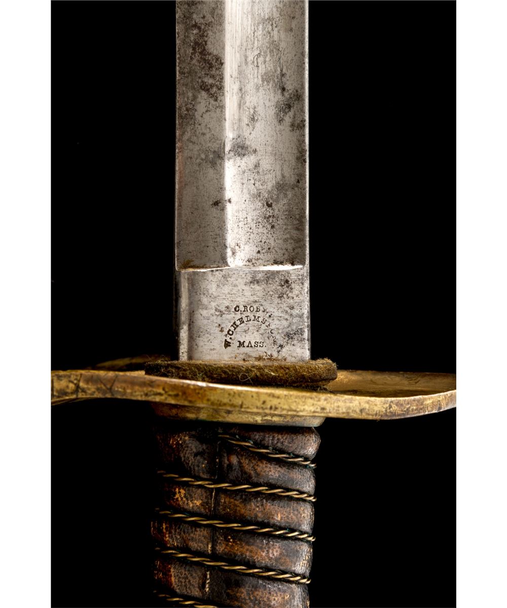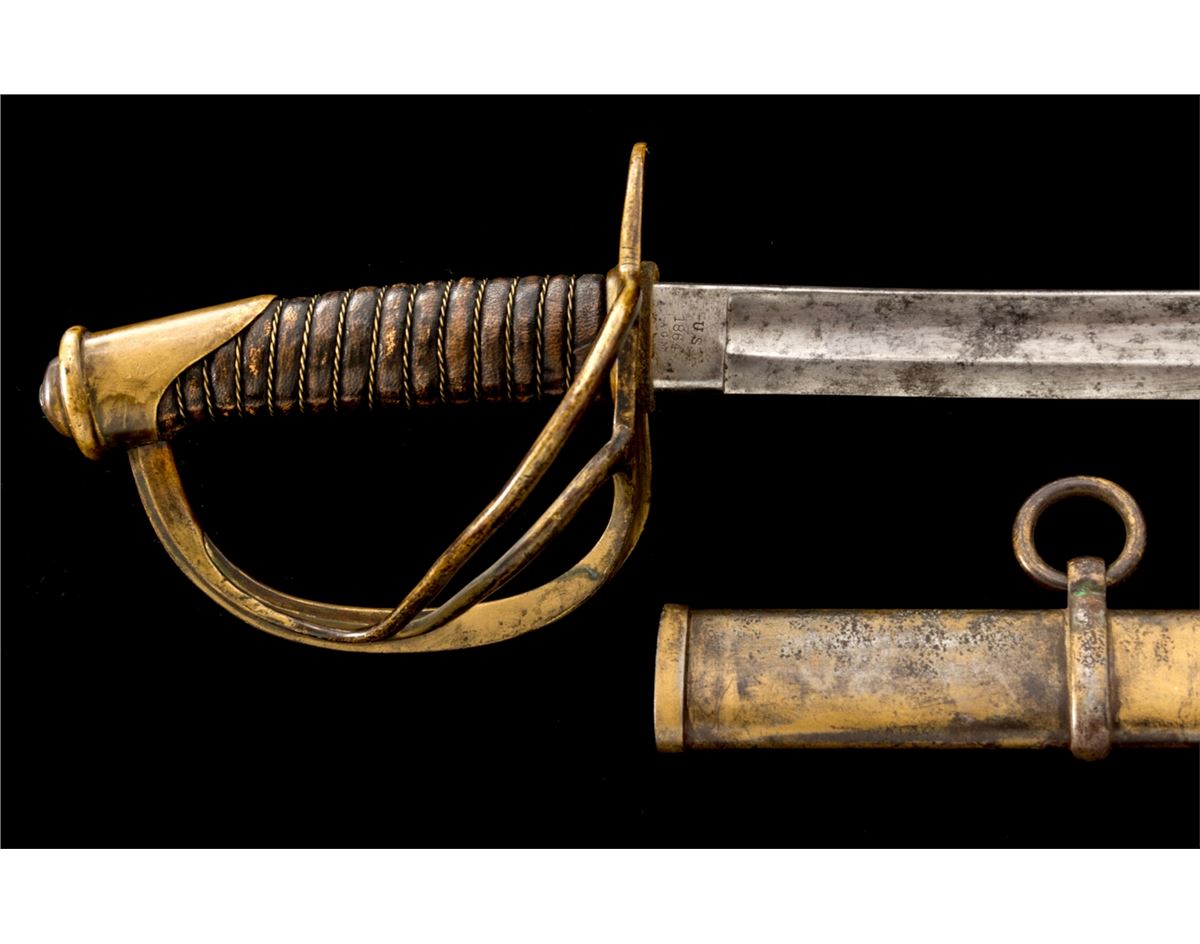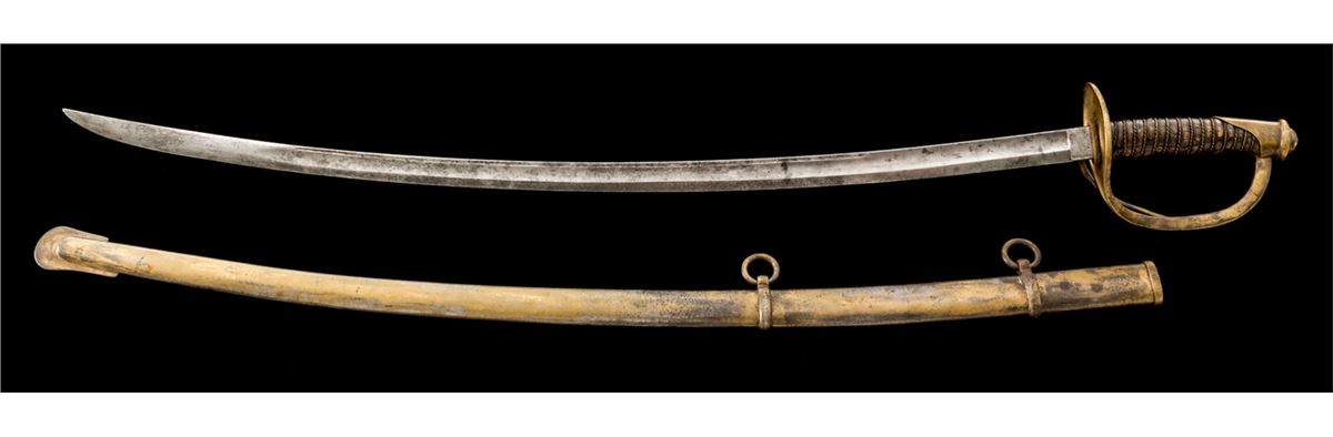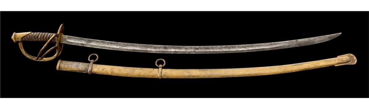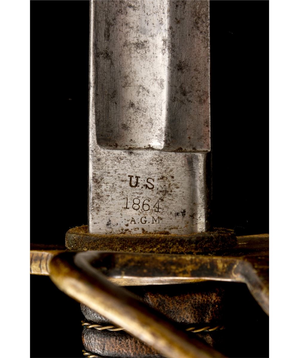 Model 1860 U.S. Light Cavalry Officer's Saber, by Roby, 35'' blade, 41.25'' overall, 1'' wide at guard. Right side of blade marked ''U.S./1864/A.G.M.'' Wire wrapped leather grip with brass guard and pommel, and gold colored iron scabbard. Condition is very good. Blade shows light to just moderate carbon spotting. Wire wrap and leather show only minor scuffs but no losses. Scabbard with very light pitting to upper half. Est.: $500-$750.