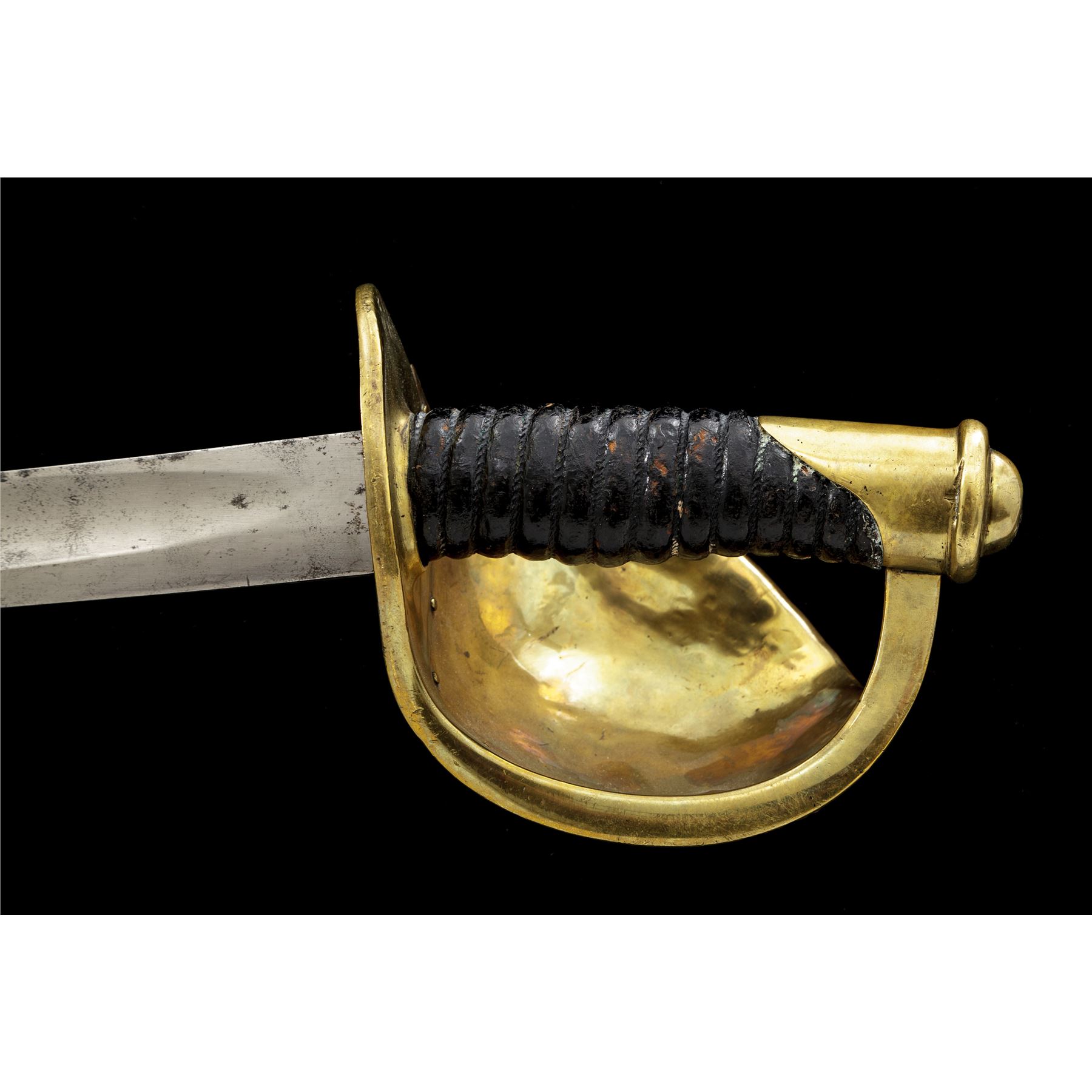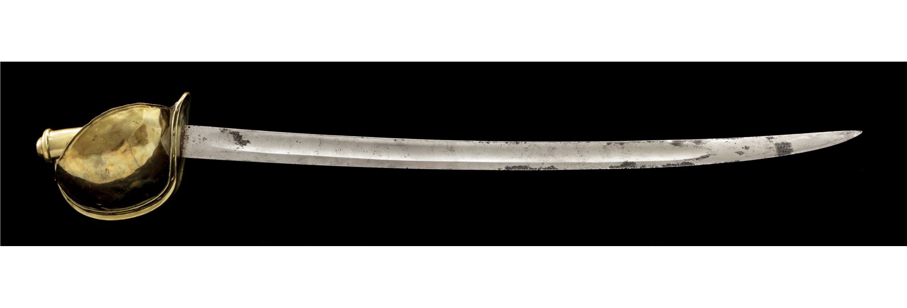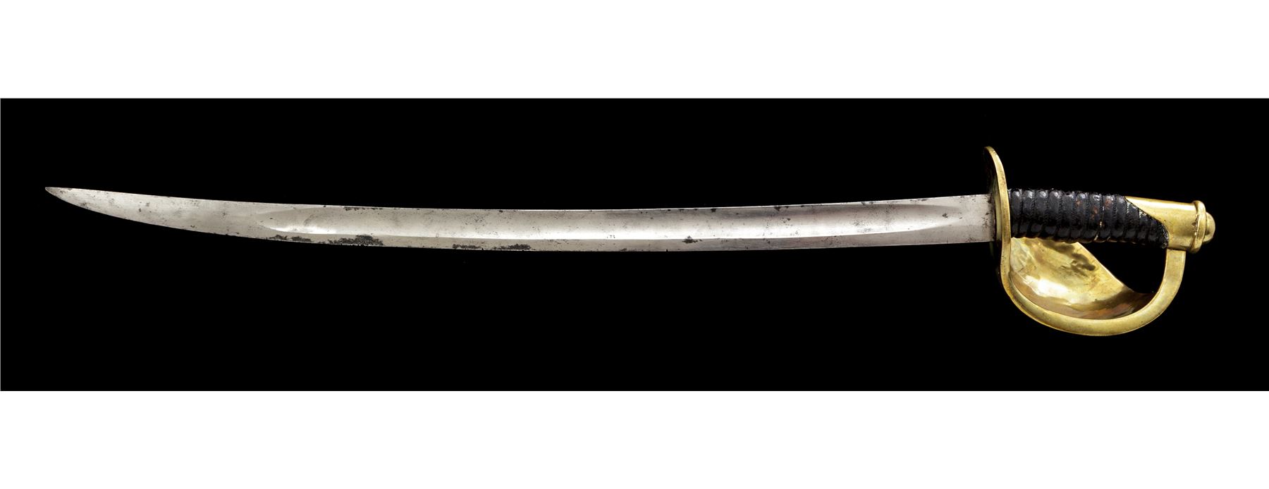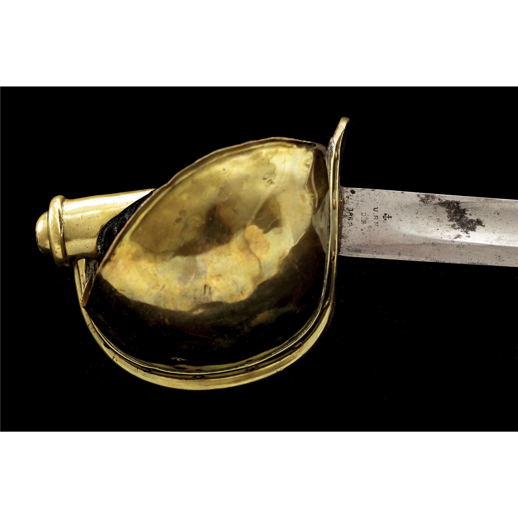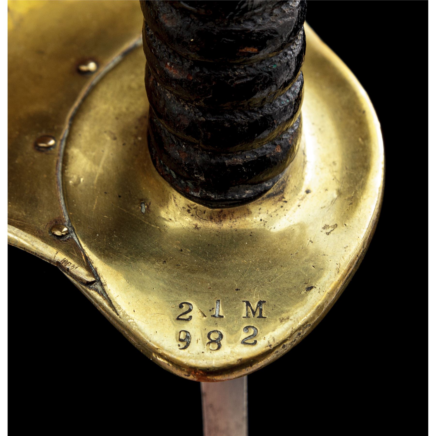 Model 1862 U.S. Naval Cutlass, with bright 25-7/8'' wide fuller blade, marked at ricasso area with an anchor stamp, and ''U.S.N., D.R., 1862'' inspector's stamps; reverse of ricasso area is not marked, but was probably made by Ames Mfg. Co., as they were the main contractor for this model. Handle features a wooden grip covered with leather, twisted wire wrapping having been removed, as was customary with later issue of these cutlasses. Large sheet brass knuckle guard is riveted to the solid brass guard, with a brass pommel cap. There are rack numbers stamped into the quillion area of the crossguard of ''21M, 982''. Additionally, there are inspector's initials ''D.R.'' stamped into top of pommel. OAL is 31.5''. Condition is good with blade retaining most of its factory polish, showing a few edge nicks, and some small areas of heavy pitting that have been cleaned. The guard, basket, and pommel have been polished bright. Leather covering on the grip has a few scuffs and dings commensurate with age. There are remnants of the original leather blade washer. No scabbard. Est.: $500-$700.