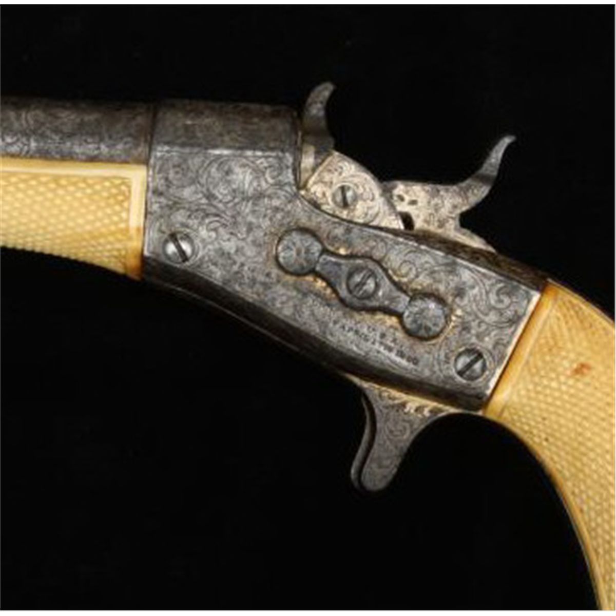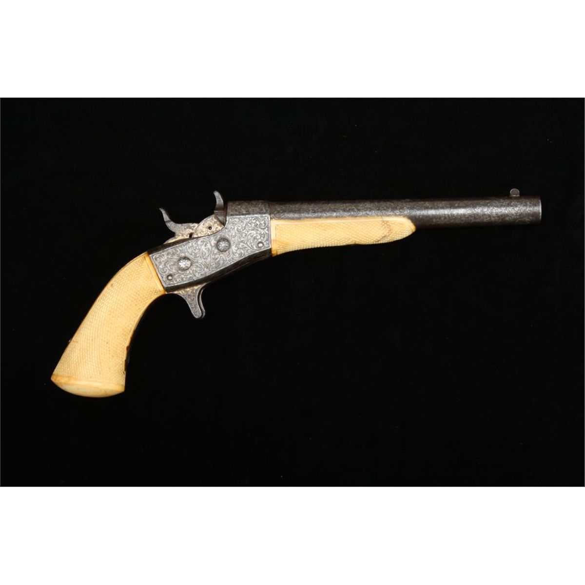Model 1866 Remington Rolling Block spur trigger navy, .50 caliber centerfire, fully and finely period scroll engraved in the style of LD Nimschke, gold and silver wash, checkered ivory stocks, serial #3. The pistol shows strong traces of original silver and gilt finish drifting to patina with some scattered erosion and beginning pinprick pitting and darkening, and is completely uncleaned and untouched. The ivory stocks are sharps and show a lovely patina, a couple of cracks and small losses, normal aging, but very good plus and absolutely original to the period. The action is tight, the bore is near excellent. The pistol has been carriedand used but not abused, found in Montana. The engraving is of a very high quality nature and shows profuse Nimschke style flows and wolf’s head engraved on each side of hammer. Only a handful of original ivorystocked Remingtons are known, and with this low number and ornate engraving, it was most probably a presentation arm that headed west. One of this cataloger’s favorites as it has “the look”. Provenance, John Fox, Jerry