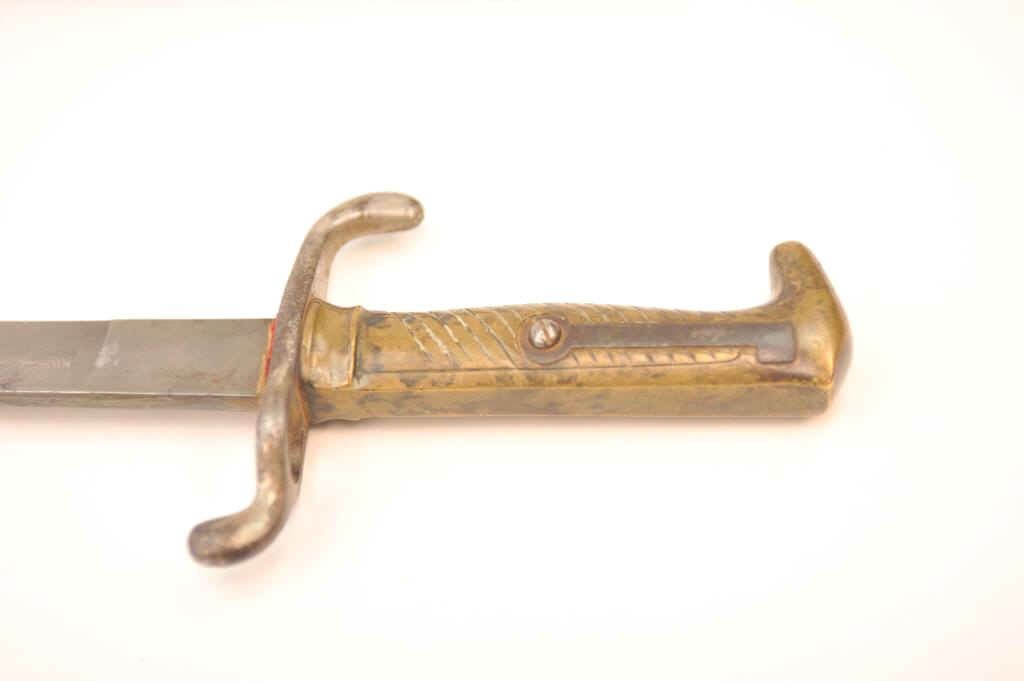 Model 1871 German/Prussian dress bayonet with etched blade with the matching scabbard. The bayonet is 23 ½” in total length with a 19 ½” blade. The unmarked blade has gone to grey patina, with no signs of sharpening andthe etching is faint, showing overall good uncleaned condition. The handguard is iron and the grip is smooth brass with an eagle head pommel. The black leather scabbard is in good condition with nickel at the throatand tip. Est.: $200-$400.
