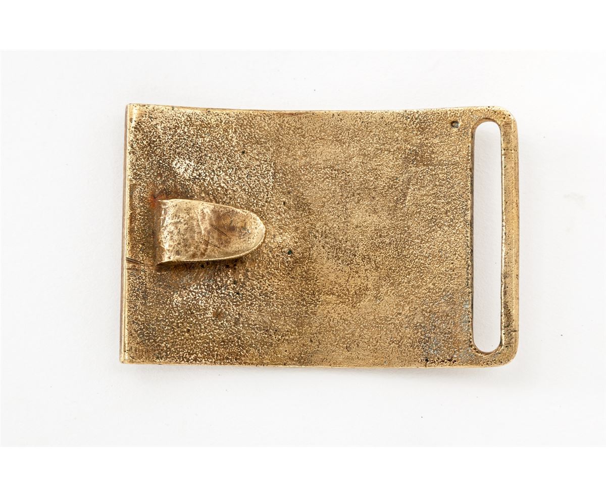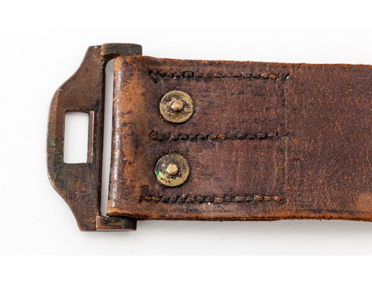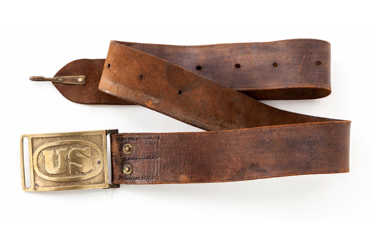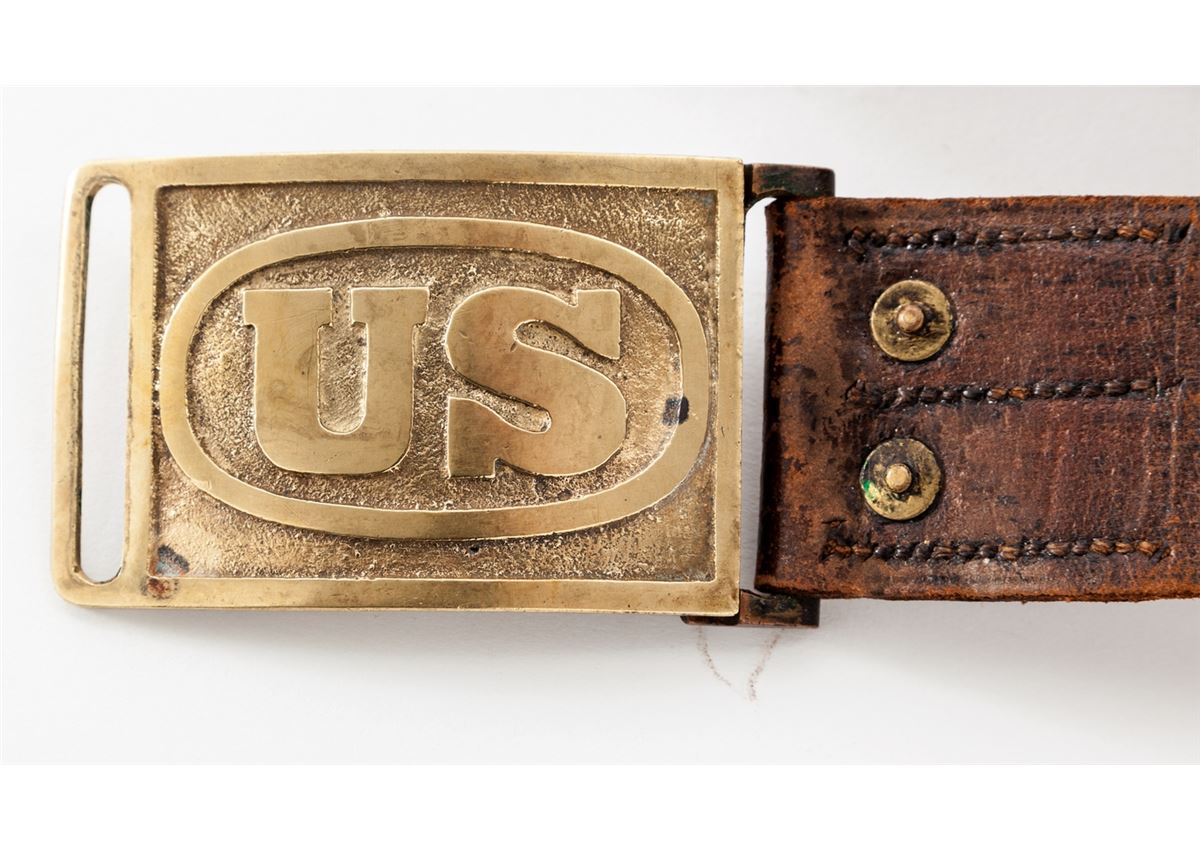 U.S. Model 1874 Waist Belt Plate and Brown Leather Belt, plate measures 2.10''x3.20'', adopted in 1874 as the standard plate, and designed by Col. P.V. Hagner. Brown leather belt measures approx. 40''x1-3/4''. Condition is excellent showing good detail and light scuffs to high edges. Leather with faint arsenal markings and light preservative treatment to outside surface. Est.: $300-$500.
