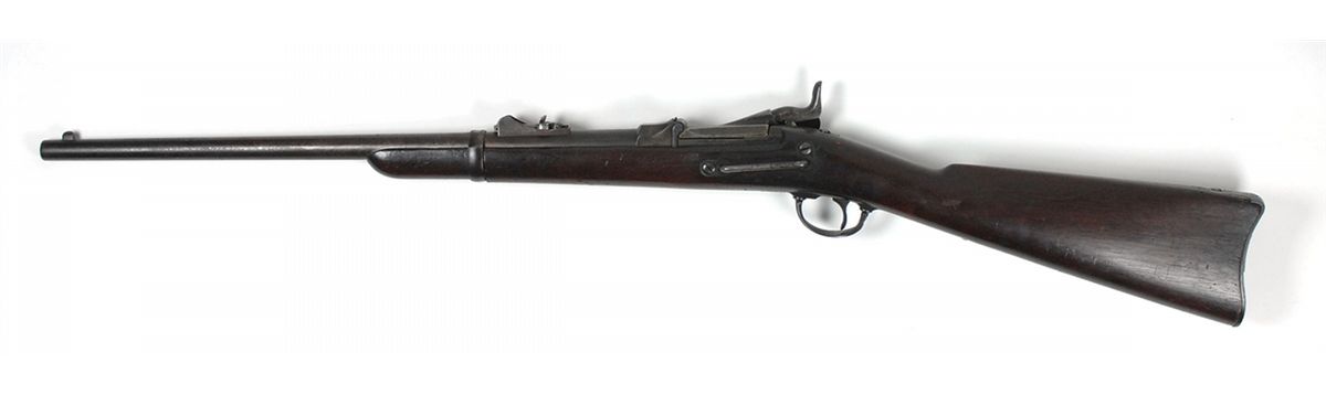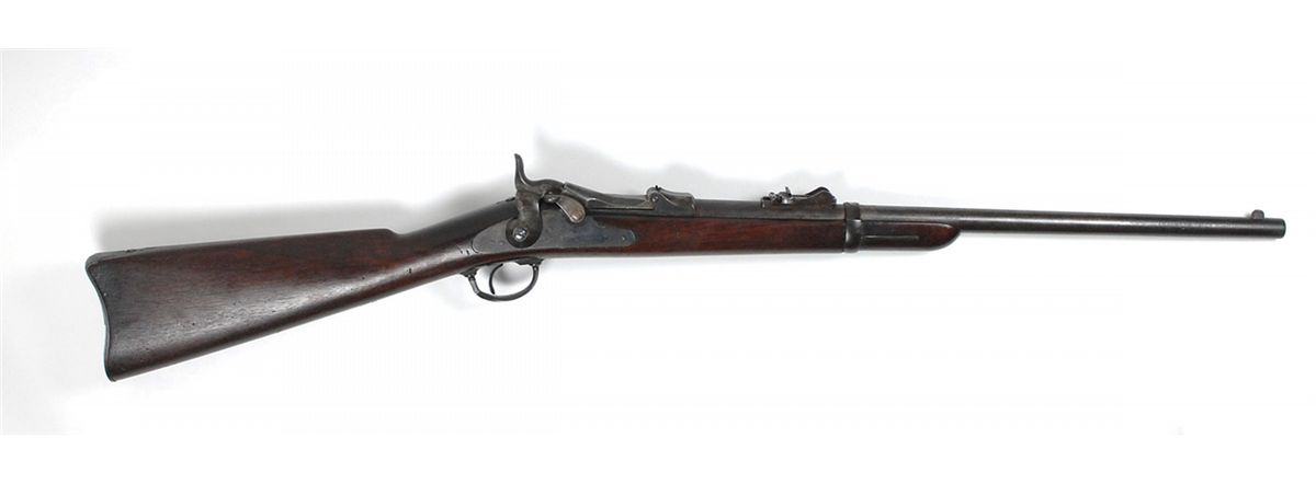 #220186, cal. .45-70, 22? barrel, the bore with good rifling and scattered light corrosion should clean to very good or better. The lockplate is marked with an eagle and “U.S./Springfield,” the low arch breechblock is correctly marked “U.S./Model/1873,” there are no legible proofmarks on the barrel and the buckhorn rear sight is correctly marked with a “C.” Most of the barrel has a plum patina, the breechblock has some light case colors on the underside, and the lockplate and trigger guard have traces of blue mixing with patina. The stock has some added oil and shows only minor small handling marks and very little wear, however the inspector’s cartouche is light and the date is difficult to read. The trigger guard was made from a rifle trigger guard and the barrel band is the later 1884 style for a Buffington rear sight.