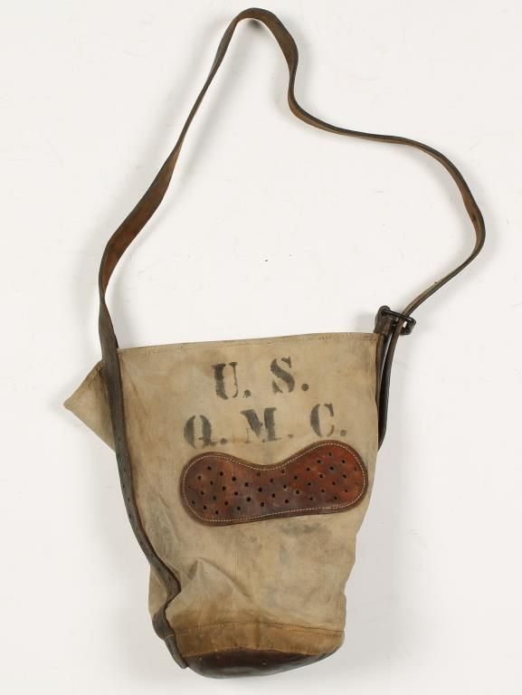 Circa Indian Wars period. Drab canvas and brown leather construction. Marked "U.S. Q.M.C.". Shows age with staining to canvas and cracking and scratches on leather.