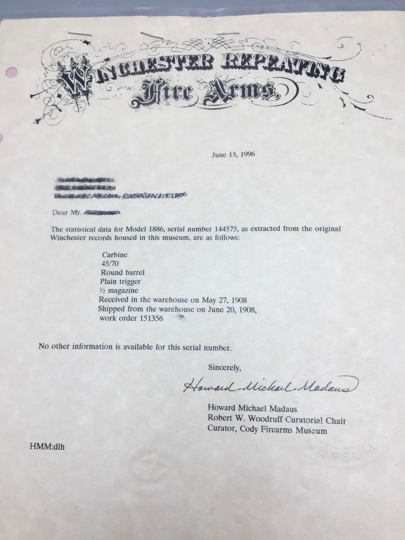 Description: For your consideration we offer for sale this Model 1886 Winchester carbine lever action rifle with letter of authenticity.