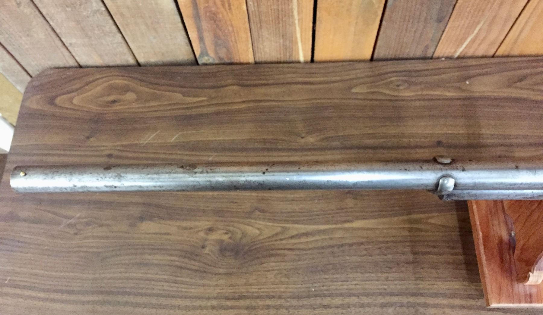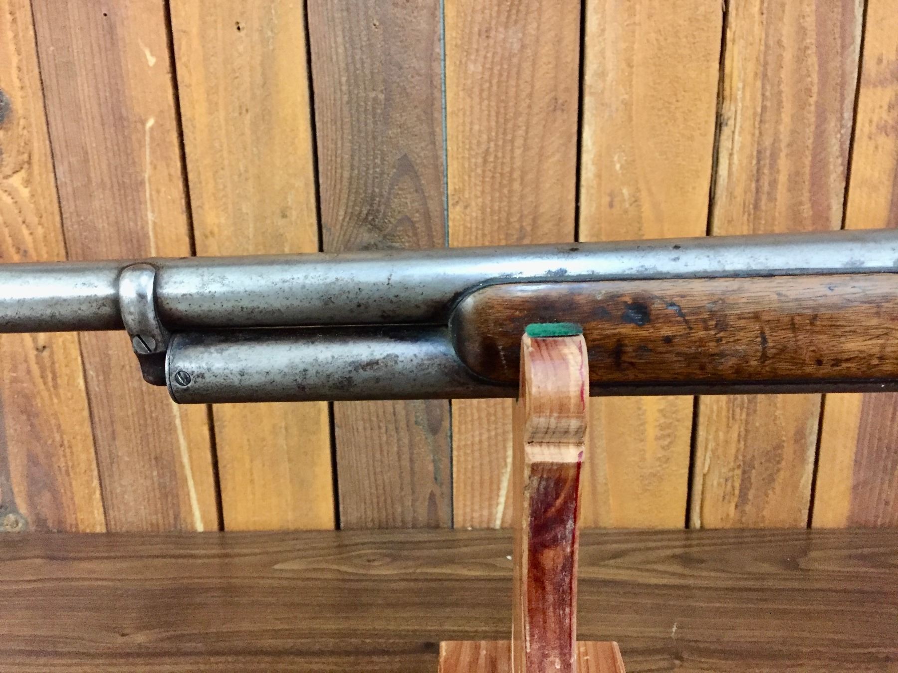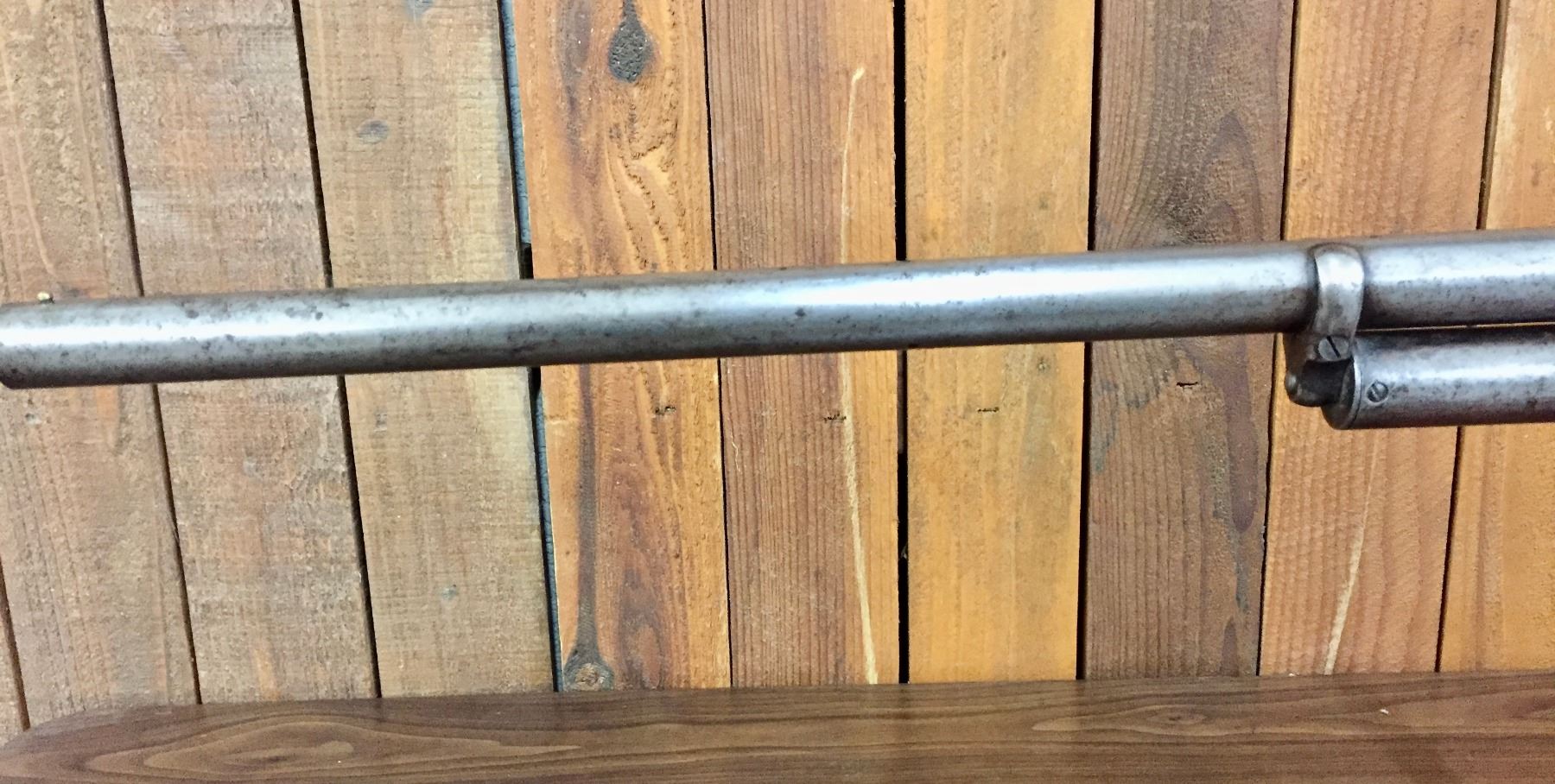 Size: Barrel measures 30" long with an overall length of 47". Condition: Fair for its age, wear expected. Appears to be all original but has very little finish left on the metallic parts.