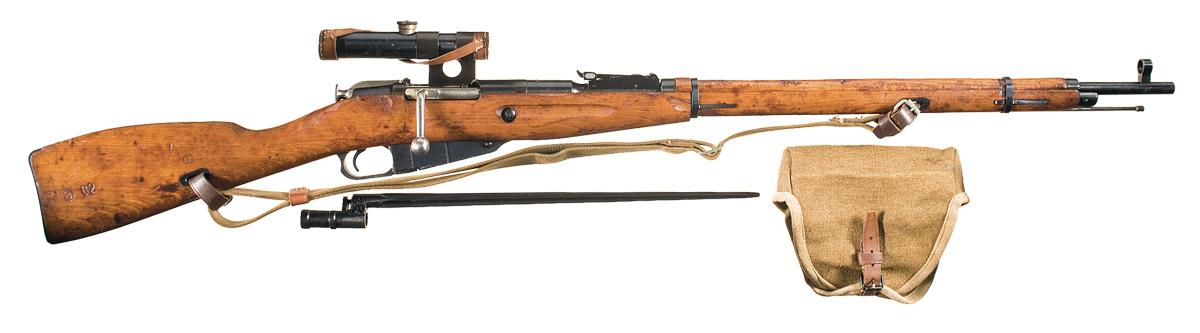 The rifle features post front and tangent rear sights and is equipped with a PU scope. The scope is marked "41 / 1952 3440 / 524949". Complete with leather lens covers and a canvas cover. The top of the barrel has the Hungarian "02" code over "1953" (the year of manufacture) over the serial number (BC3444). Turned down bolt handle with the bolt numbered to the gun. The buttplate and magazine floor plate are also numbered to the gun, with the buttstock stamped with a circled "B", "02", and a circled "1". Complete with a canvas sling and bayonet. The bayonet has the number "A53578".
