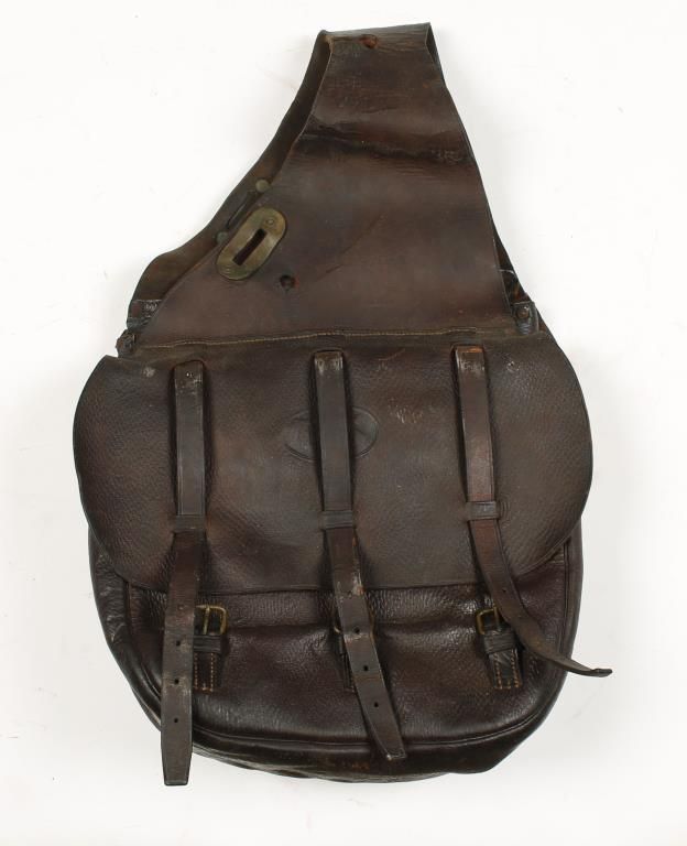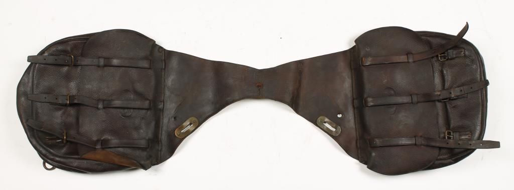 Black leather stamped "ROCK ISLAND ARSENAL E.H.C". With "US" inside of oval stamped on each flap. Intact with all original fastenings and straps. In aged condition with cracking, warping, and oxidation and leather has been repaired with a patch.