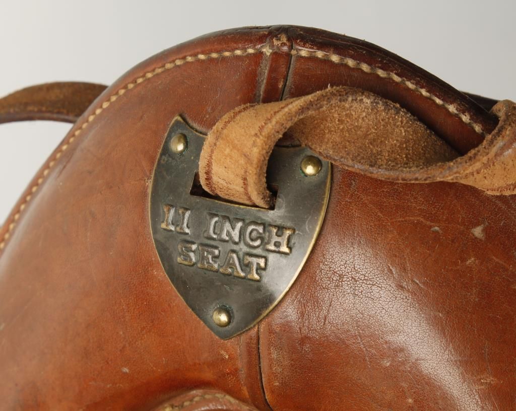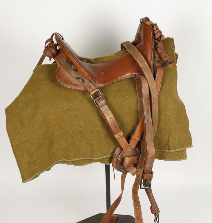 Brown leather construction with brass components. 11 inch seat. No stirrups. Shows age. Includes standard issue olive green blanket.