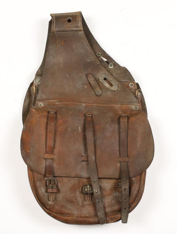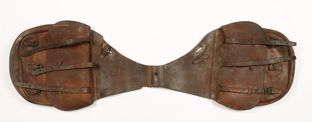 With liners. Brown leather, stamped with initials. Also stamped "US" inside of oval on each flap. 1 of the closure straps has been broken with only 50% of the strap remaining. In aged condition.