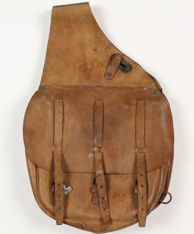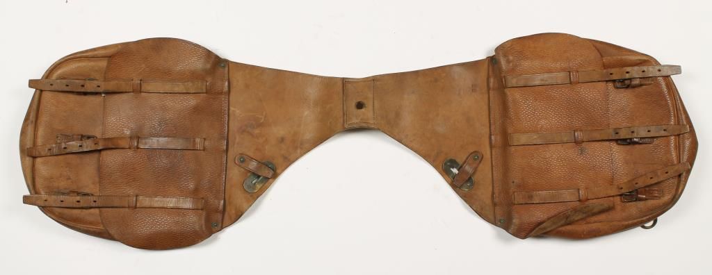 Light brown leather saddle bags with "US" inside of oval on both flaps. Also stamped "Spalding 1917". Includes liners. Leather shows some age and there is some corrosion to the metal.