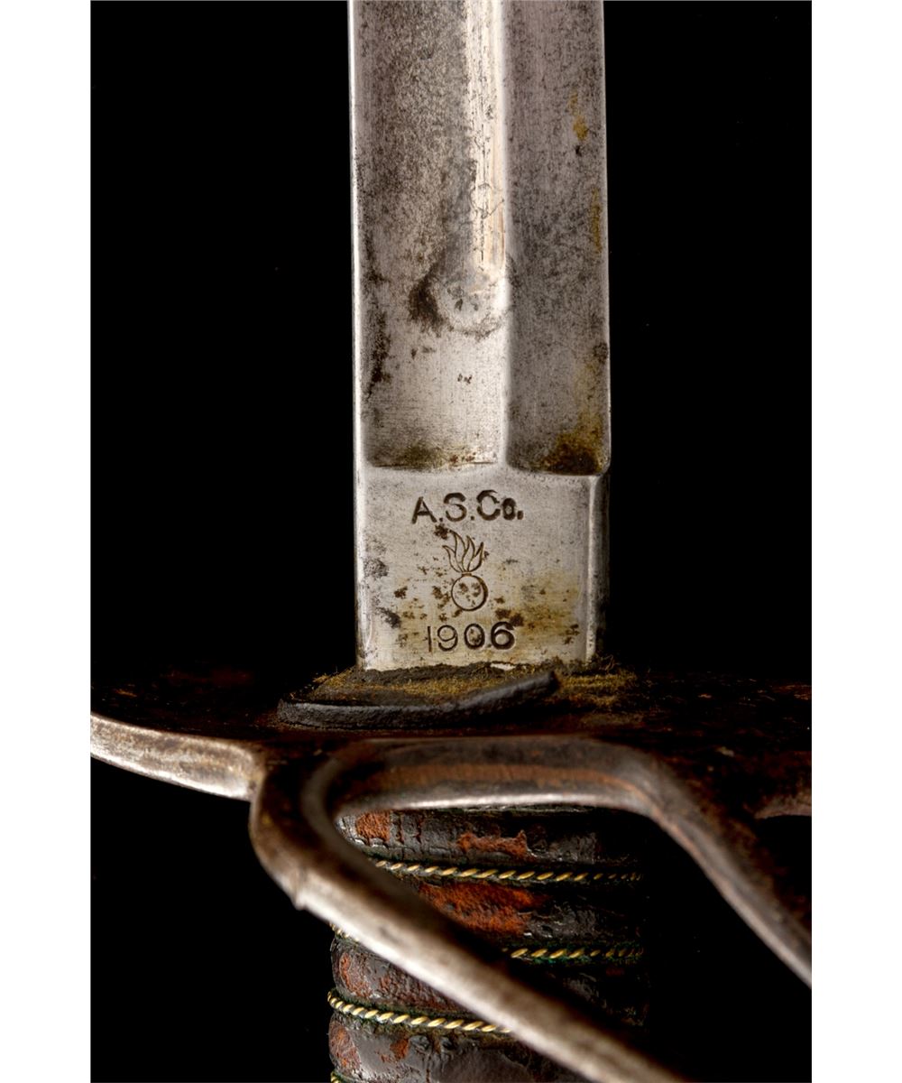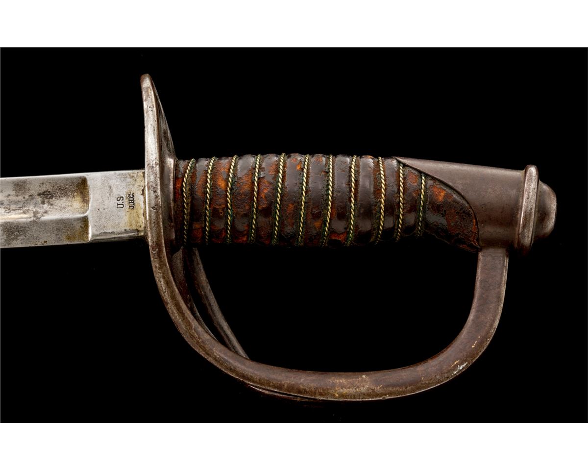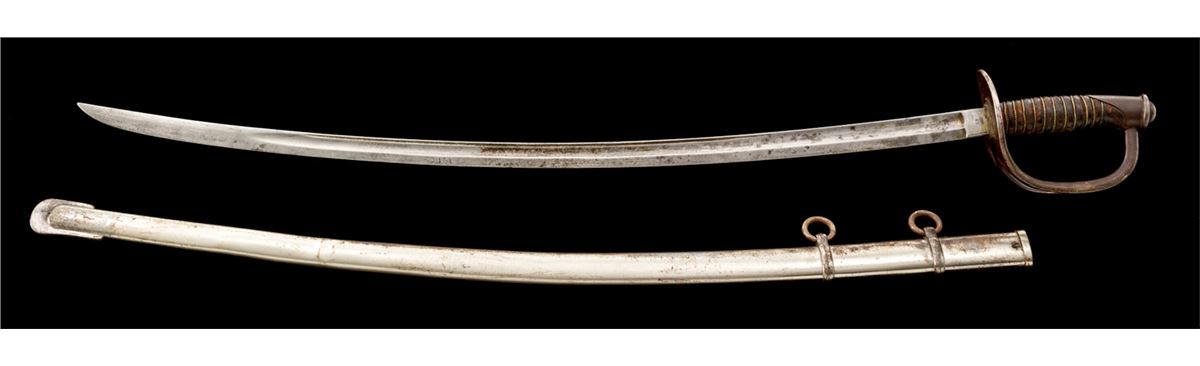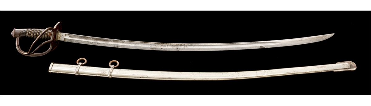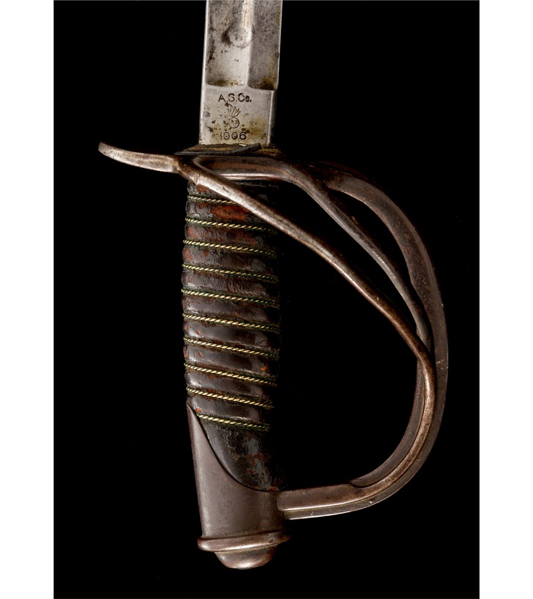 Model 1906 Heavy Cavalry Saber, marked ''A.S. Co.'' (Ames), 35'' blade, 41'' overall, blade being 1'' wide at guard. Wire wrapped leather grip with iron guard, pommel and scabbard. Condition to sword is very good with moderate carbon spotting to blade. Guard and pommel have toned. Grip wrap is tight, leather shows moderate scuffing. Scabbard with scuffs and dings, appearing to have been polished and lacquered at one point. Est.: $400-$600.