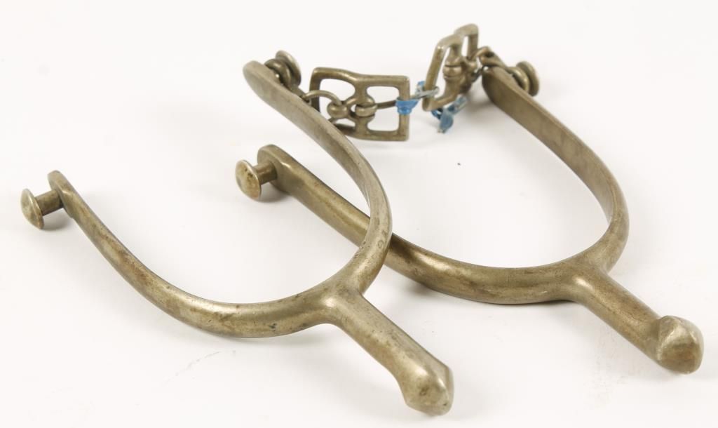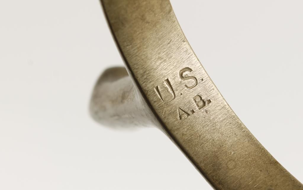 Brass spurs marked "U.S. A.B." Includes attached buckles but no straps. The yoke is approx 3-3/4" long x 2-3/4" wide. The shank is approx 2" long, no rommel. Shows age, dark patina.