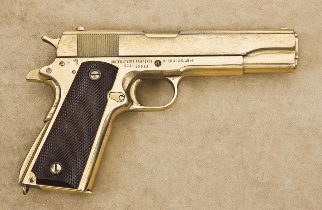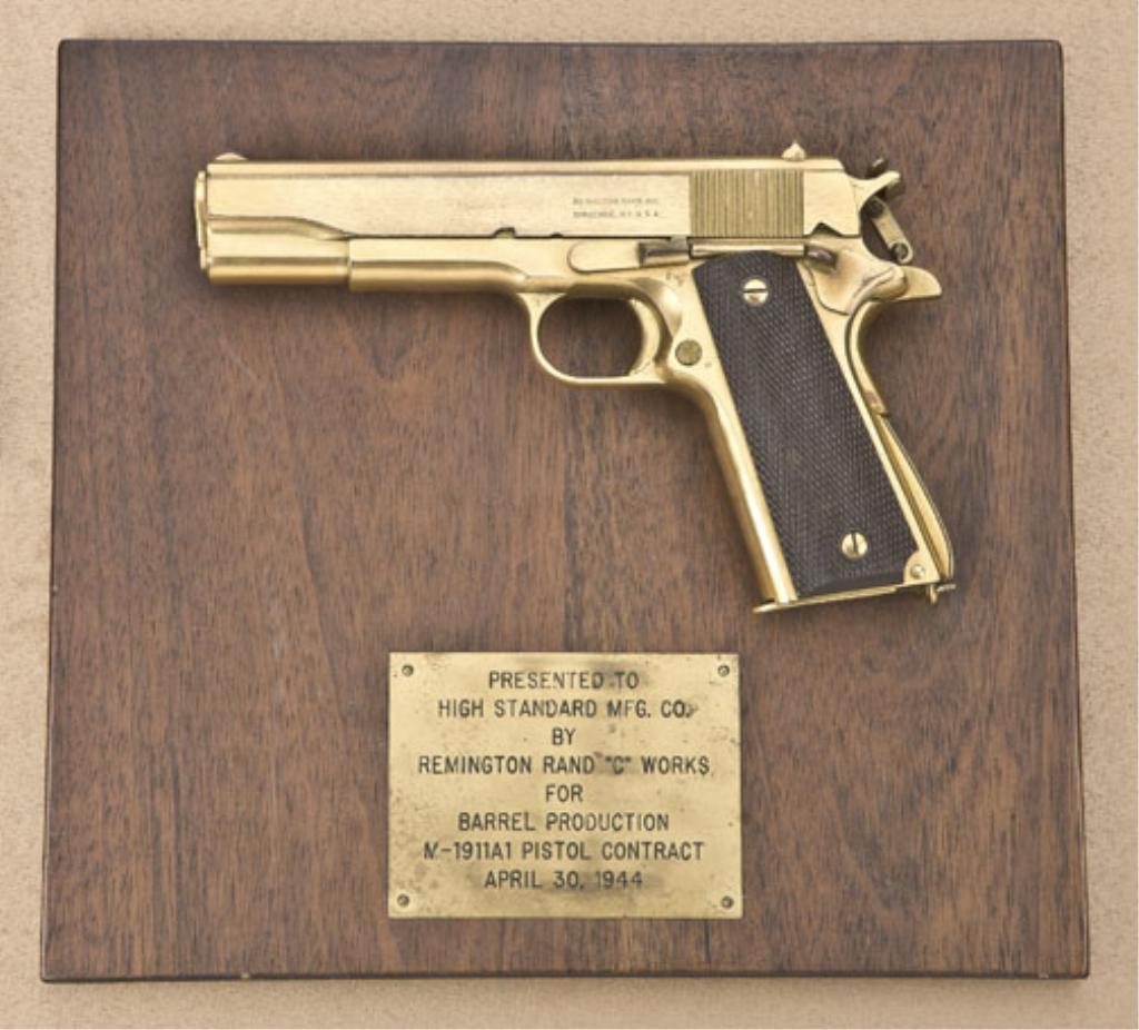 Model 1911A1 by Remington Rand, .45 ACP  caliber, special presentation grade with full  gold-plated finish and mounted on plaque  which is period inscribed, “Presented to High  Standard Mfg. Co. by Remington Rand ‘C’Works for Barrel Production, M-1911A1 Pistol  Contract, April 30, 1944”. Serial number  “1915082”. This pistol was accompanied by a  1997-dated later by noted expert and author  Scott Meadows attesting to the originality of this 1911A1, and stating it is one of two  known, the other being serial number  “1,000,000”. Also accompanied by a letter  from Charles Petty, editor of American  Handgunner Magazine, dated September 4, 1995describing the pistol and plaque and stating  that it was found in a small gun shop in  Connecticut where it was being sold for the  Estate of a former High Standard employee.  Also this particular pistol is featured in an article by Scott Meadows for Gun Report  magazine, August 1999, pages 14 and 54 where  this and serial number 1,000,000 are pictured  together and explaining the importance and  rarity of the two aforementioned arms. The