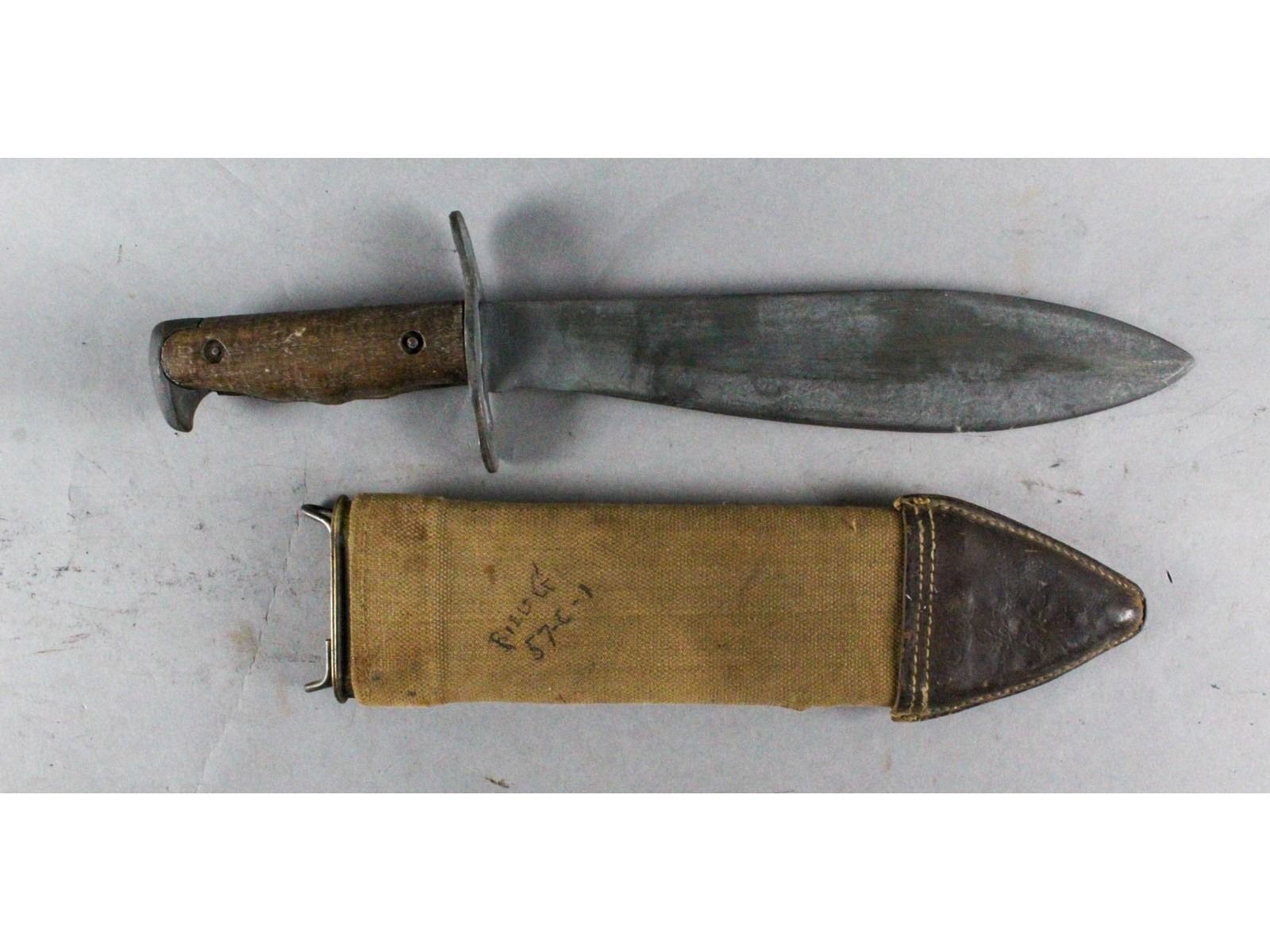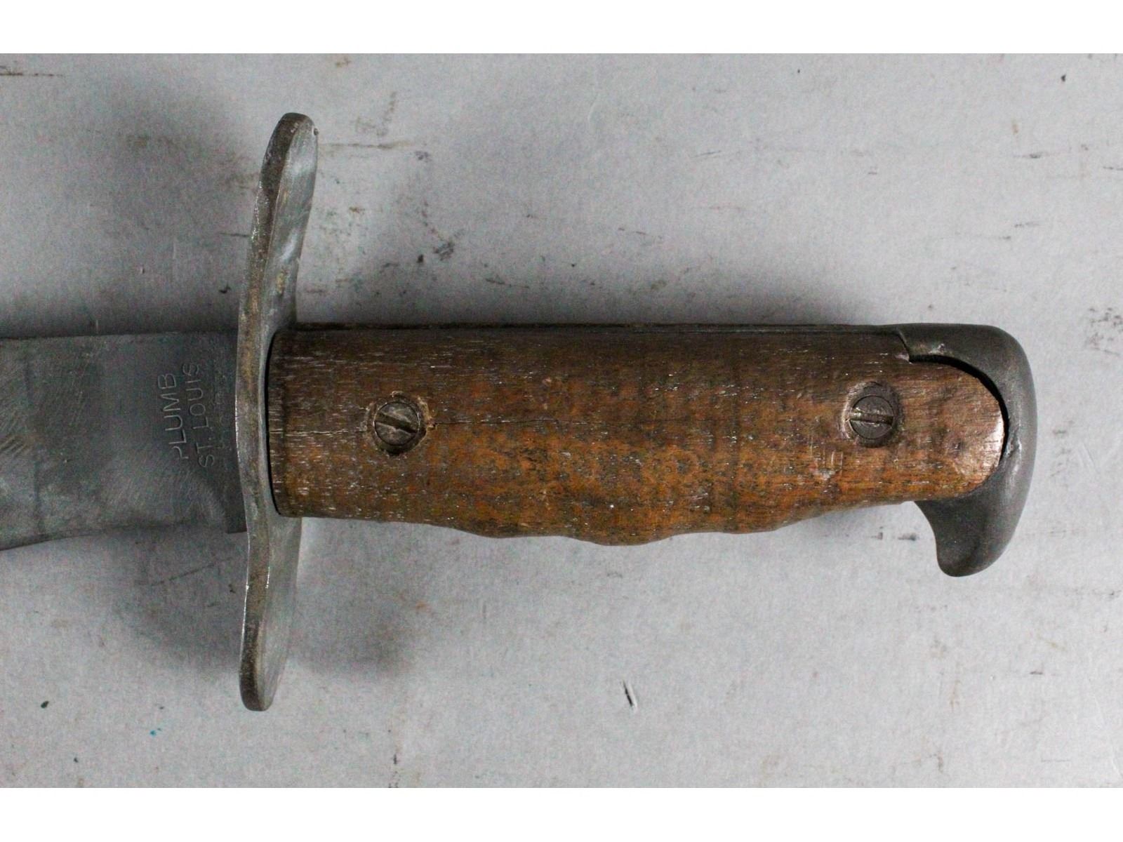 Marked Plumb St. Louis. Canvas & leather scabbard made by Bauer Bros. 1918. All show wear. Has bent crossguard. 1 cracked wood handle. Owner's name printed on webbing & signed in leather tip. Interesting personalization.