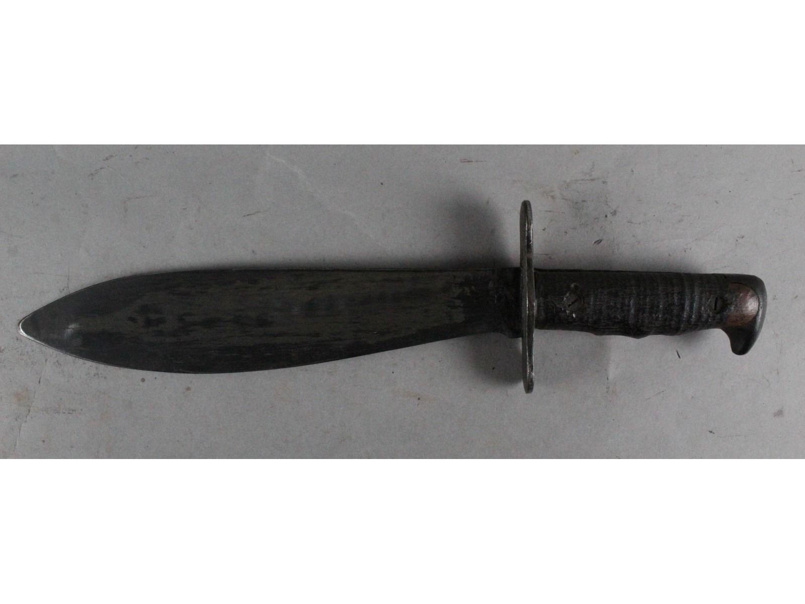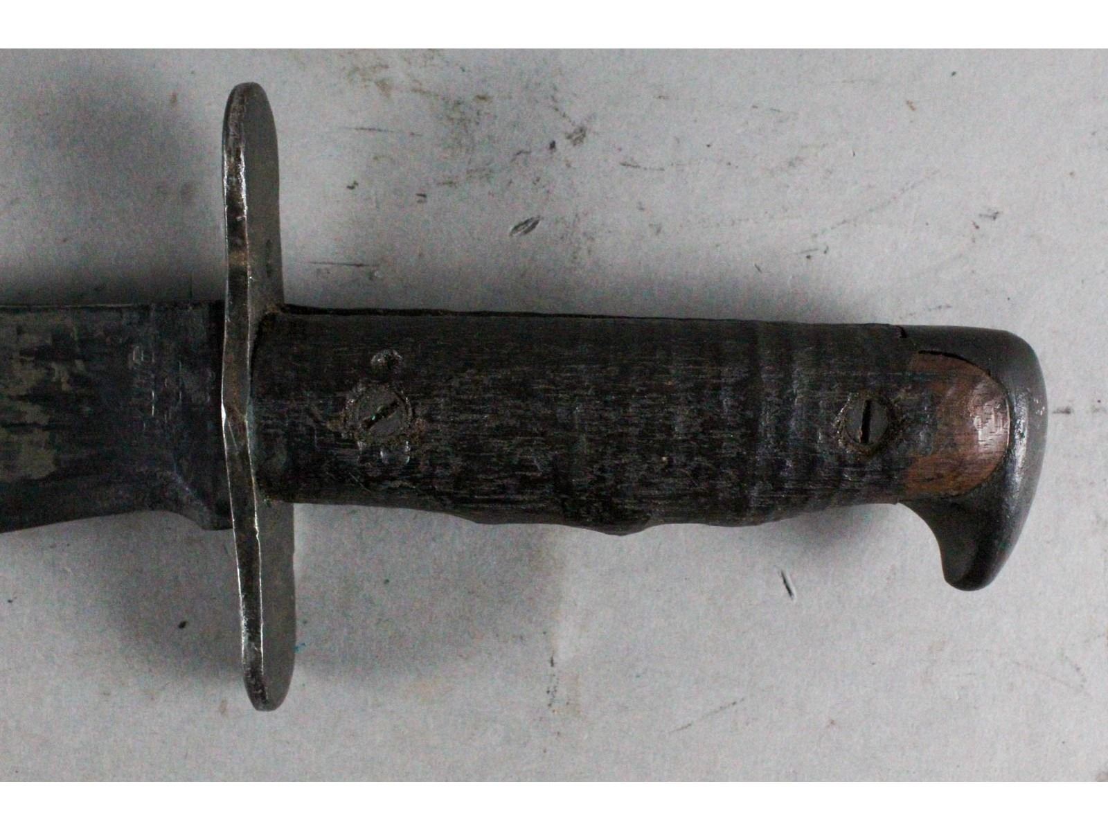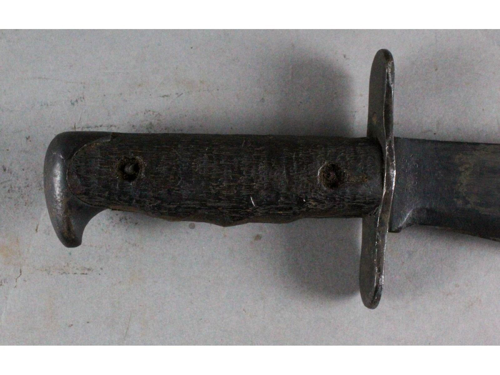 Marked Plumb St. Louis. Dark wood grips & blued blade with only slight wear. good Bauer Bros 1918 scabbard. Leather is good but missing sheen.