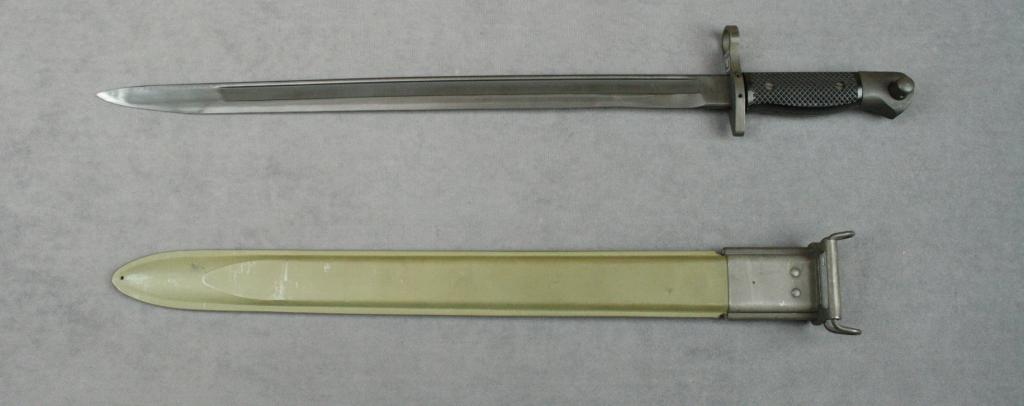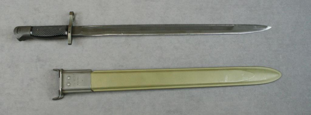 Model 1917 bayonet with sheath marked  “U.S.-M1917, B.A. INC.” in overall very good  to fine condition showing what appears to be  an older arsenal re-finish with no visible  markings on the hilt.  Est.:  $200-$400.