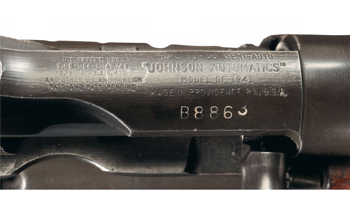 This is an example of a WWII Model 1941 Johnson Semi-Automatic Rifle. This rifle was seriously considered by the U.S. Army and Marine Corps as an alternative to the M1 Garand Rifle in 1941. Although the Army never officially adopted the Johnson rifle, after the fall of the Dutch East Indies to Japan in 1942, some of the Dutch contract rifles were obtained by the Marine Corps as a war expedient model that were subsequently issued to the Marine Parachute and Raider Battalions for use in the early island hopping campaign in the South Pacific in 1943. The Johnson rifle has several unique features, two of them being that they have a removable barrel for easy storage in a parachute jump bag and the second being that their rotary magazine, which held ten rounds, could be easily topped off with either single or multiple rounds before or during a battle; something that the M1 Garand rifle did not have the capability to do. The receiver is marked with the standard five line patent dates followed by the four line "JOHNSON AUTOMATICS/MODEL OF 1941" logo, address and the serial number "B8863". The barrel flange is correctly marked ".30-06" above the barrel and "41" below it. A circled five-pointed star and "CRANSTON/ARMS/CO." in a triangle are marked on the right side of the receiver below the rear sight. The rear sight is correctly marked "M2" on the left side with the calibrations correctly marked in meters on the right side. This rifle is complete with a WWII style unmarked leather sling with steel keepers.