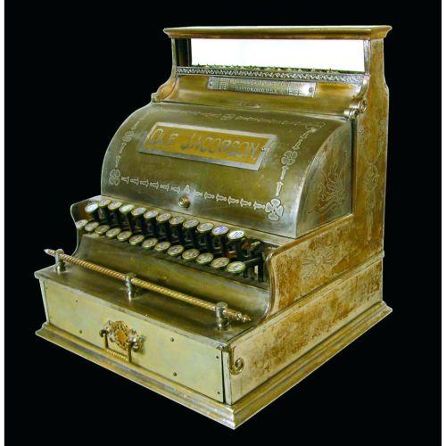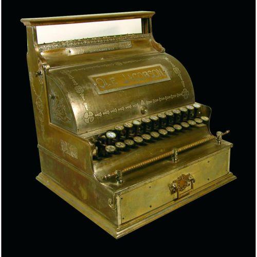 Model number 2 National Cash Register, serial number 13199. Sold in 1889. Rare very early register with stamped honeysuckle patterned cabinet and original lid insert. The stamped metal cabinets were the first attempt for NCR to change from the inlaid wooden cabinets to the metal machines. Featured on page 122 of The Incorruptible Cashier Vol II. Personalized for Ole Jacobson.