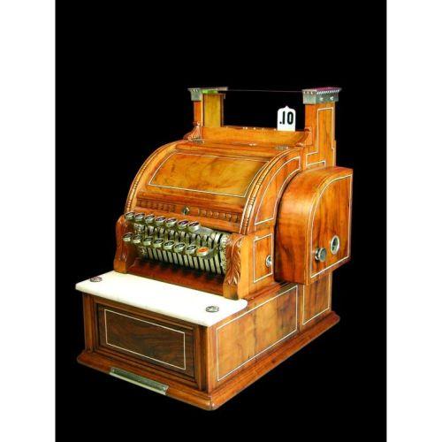 Model 317 National Cash Register A very rare and unique Wood Candy Store Register with a serial number of 1553693. This is a custom walnut cabinet with a simple inlaid Western Motif. Sold in February of 1916 to Frank Stever of St. Joseph, Missouri by D.F. Cunningham. Lid latch needs some attention to repair otherwise excellent condition.