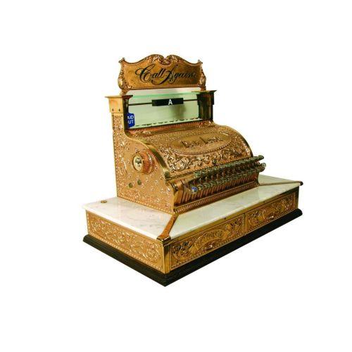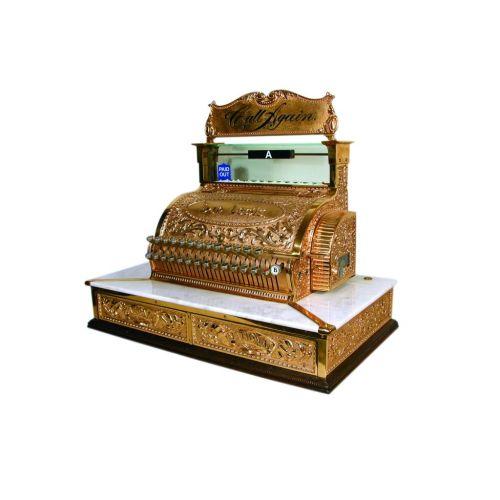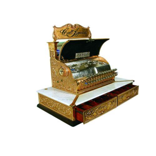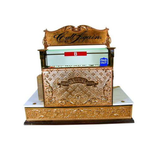 Model number 47-2 National Cash Register, serial number 283772. Semi-rare double drawer cash register with highly desirable and much scarcer Renaissance cabinet sold in 1902. A superb example that has been meticulously restored to new condition with personalized lid insert, optional time clock and an original Call Again Marquee.