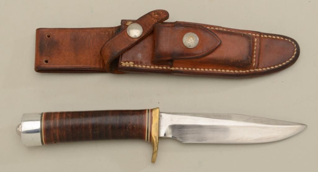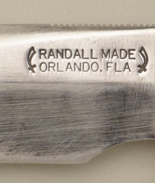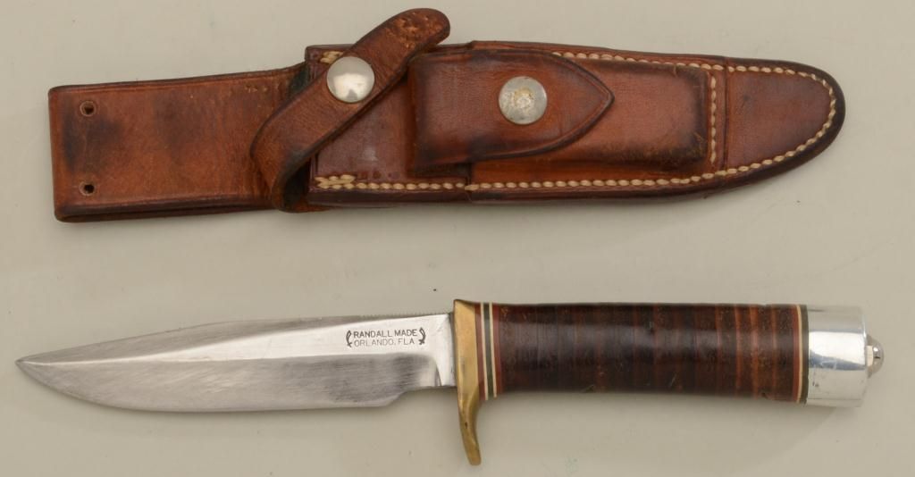 Model 5-5 Randall knife with leather sheath (Orlando, FLA) in overall very good condition with stacked leather grip; approx. 9-1/2” overall with an approx. 5” blade; sheath is good to very good. Est.: $400-$800.