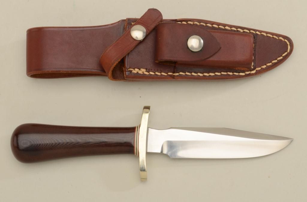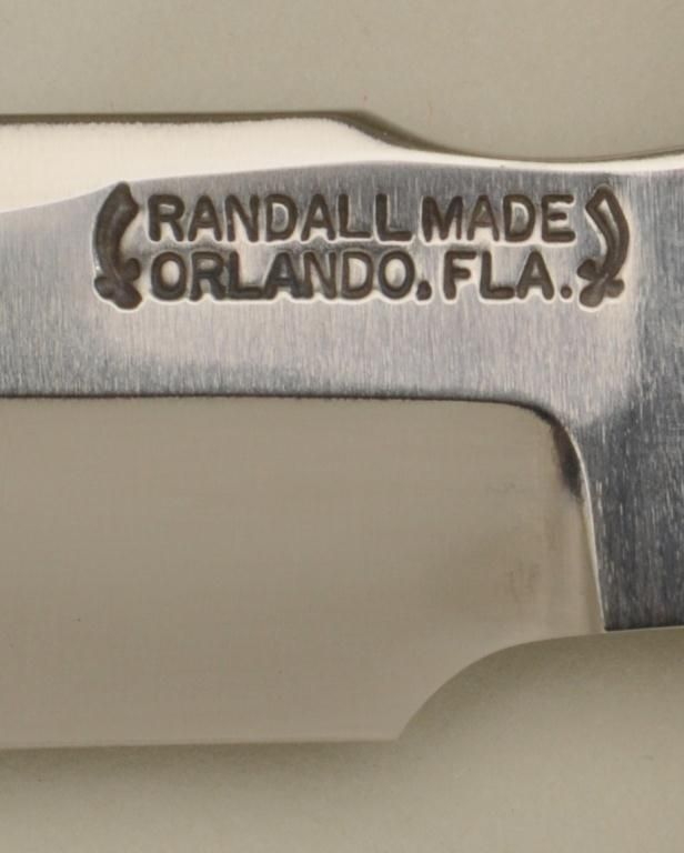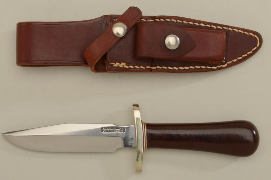 Model 5 Randall knife with leather sheath and sharpening stone (Orlando, FLA) in fine condition approx. 9-1/2” overall with an approx. 5” blade and wood grip. Est.: $400-$800.