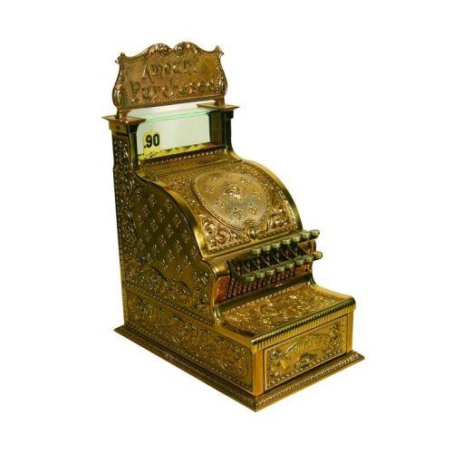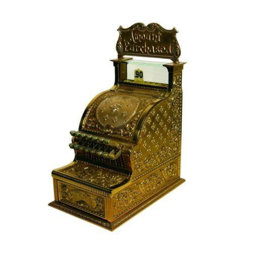 Rare Model number 50 National Cash Register, serial number 120446. A very scarce narrow Candy Store type cash register with the desirable Renaissance Cabinet which was sold in 1897. According to research, only a few dozen of these exist today. This is a nice example in original condition with a reproduction high boy marquee.
