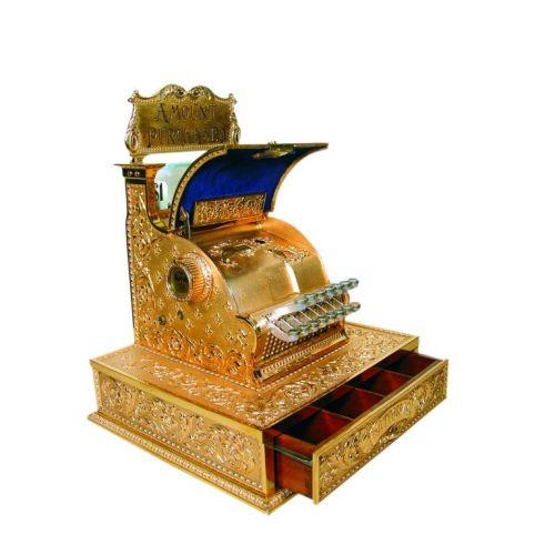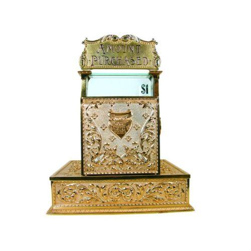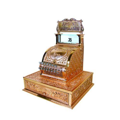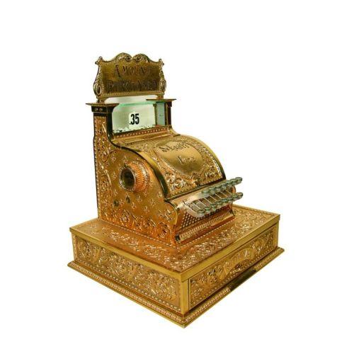 Model number 52 National Cash Register, serial Number 144768. this is a very desirable narrow extended base machine that was sold in 1898. According to the Incorruptible Cashier, Vol. 2, very few were made with the very attractive Renaissance Case Design which was quickly replaced with the Dolphin Cabinet. Only 10 or so of these exist today. This example has been professionally restored to its original condition and is equipped with a personalized lid insert, an optional time clock and a reproduction high boy marquee.