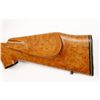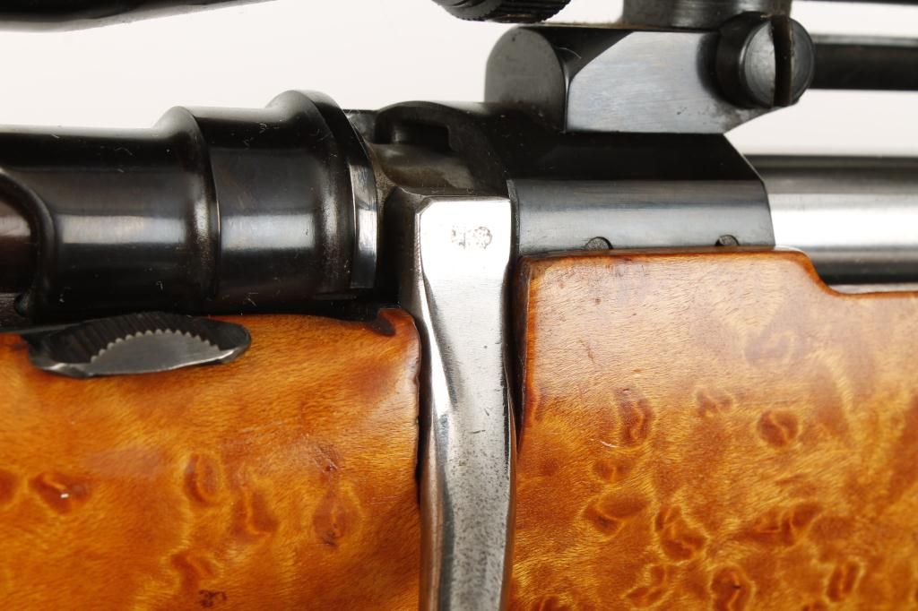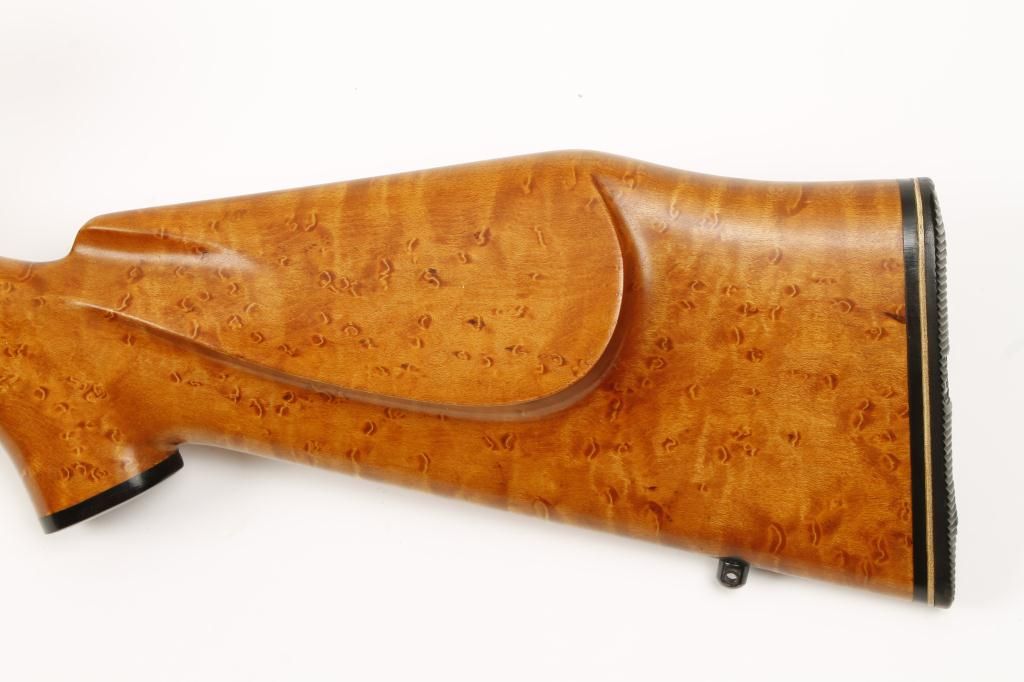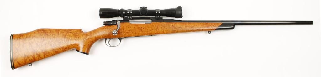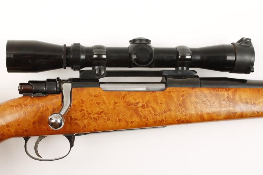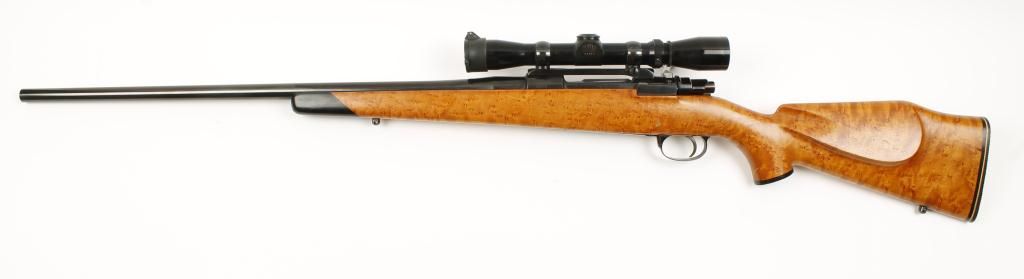 Model 98 action custom sporting rifle in 6 mm Remington Magnum caliber showing Douglas premium barrel and custom made Birdseye Maple stock by Kings Gun Works of Glendale,California. This rifle is mounted with a 2x7 power Leopold scoped on Redfield mounts. The rifle is in fine to near excellent used condition and was made for competition shooter and well-known collector John Goodlad by Kings Gun Works more than 40 years ago. The Birdseye Maple stock is finely made with great flame and burl. The forend cap and grip cap are made of hardwood probably Rosewood and show nice grain. The rifle measures 45”overall with 25” barrel and the stock measures 14” to the end of the pad. Medium weight The rifle shows a fine bore and has studs for quick detachable sling swivels. Est.: $1,250-$2,500.