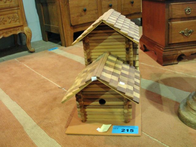 birdhouse. Handcrafted from western red and yellow cedar interlocking logs glued and nialed. Handmade cedar shingles and coated in UV protected cedar deck oil. 12"x24"x16.5". Estimated value $279-$449