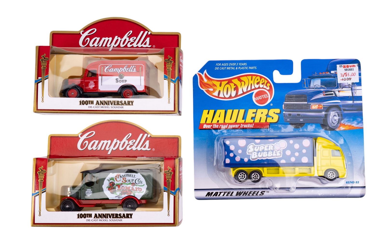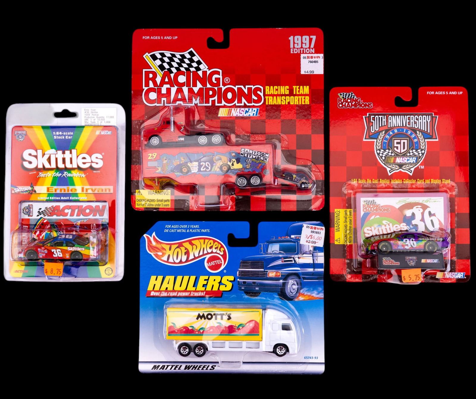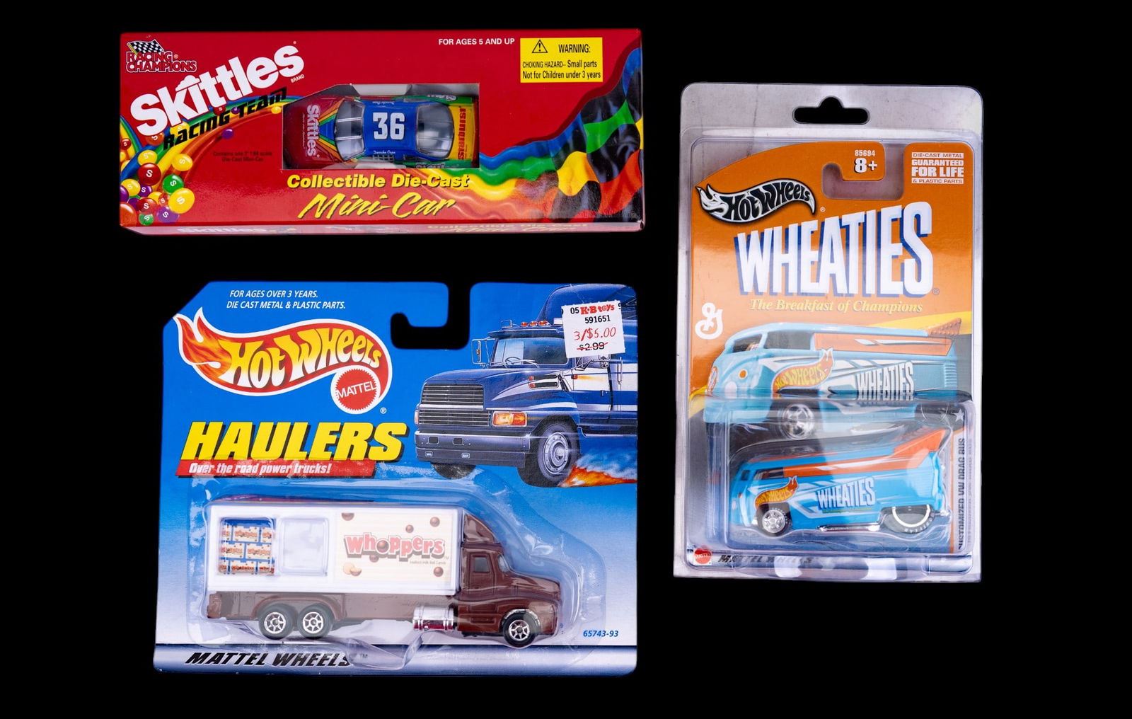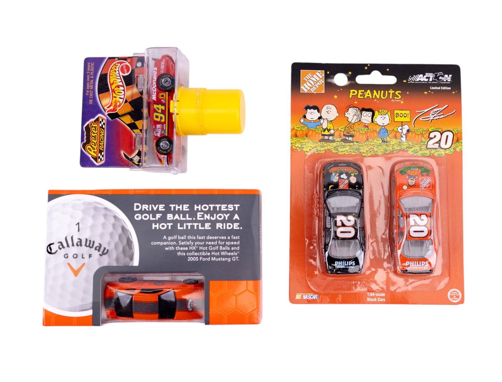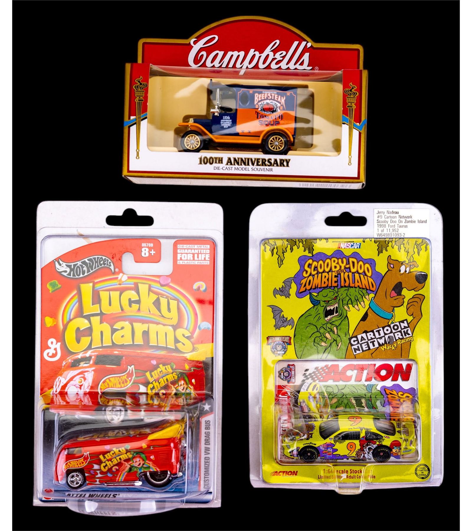 16 total branded race cars & other automobiles. 6 Hot Wheels vehicles are a Mott's hauler, a Whoppers hauler, a Super Bubble hauler, a Reese's #94 Bill Elliot racer, a Wheaties VW drag bus, & a Lucky Charms VW drag bus. Other vehicles are a Coca-Cola 1962 Volkswagen cargo van, a Racing Champions Cartoon Network racing team transporter, an Action Cartoon Network Scooby-Doo on Zombie Island #9 Jerry Nadeau 1998 Ford Taurus racer, an Action Peanuts Halloween + The Home Depot #20 Tony Stewart racer pair, 3 Racing Champion Skittles #36 Ernie Irvan racers (1 is Wild Berry 50th Anniversary), 3 Campbell's Soup 100th Anniversary transport vans, & a Hot Wheels Callaway Golf 2005 Ford Mustang GT. All items are in their original packaging, most have never been opened. See photos for further details.