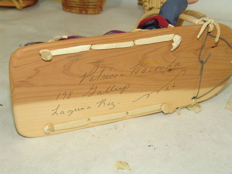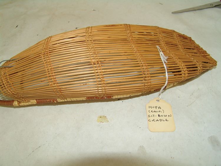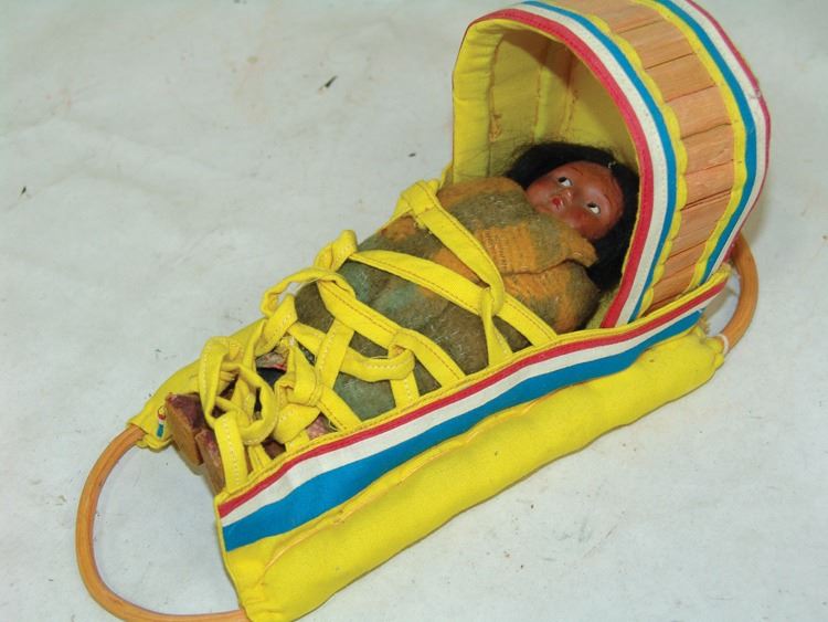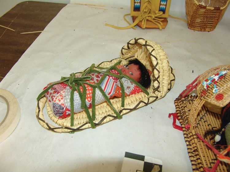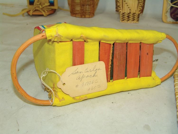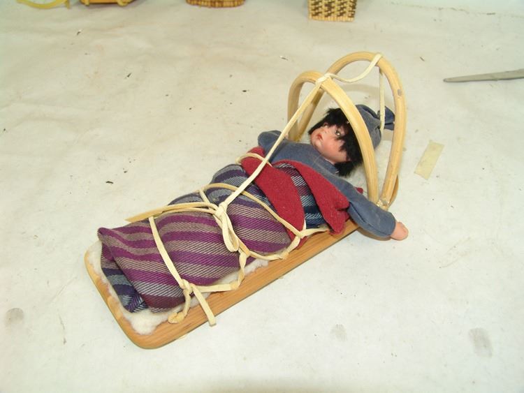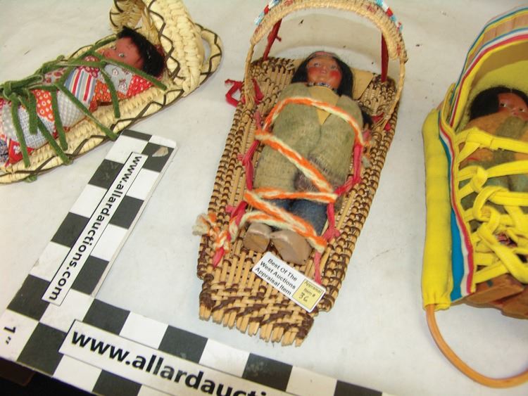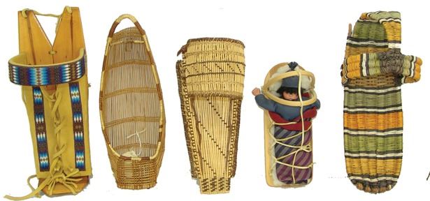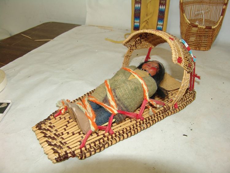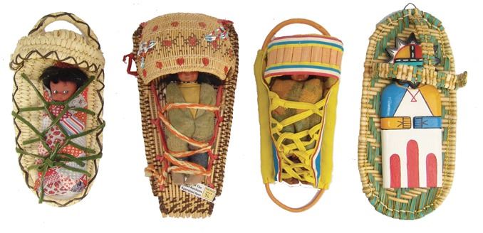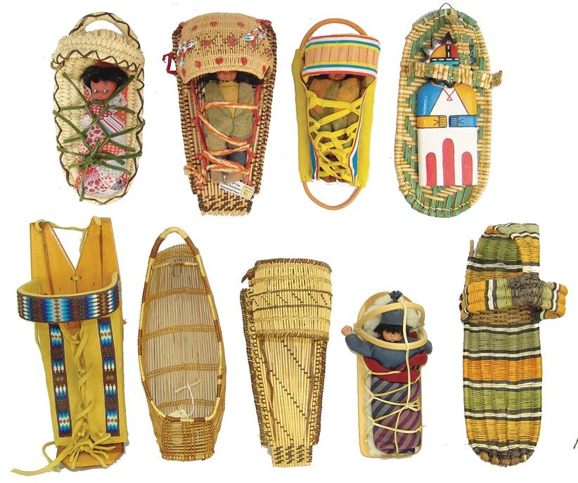 Fantastic Display of 9 toy baby carriers woven out of basketry including Papago, Hopi, and Mono examples (all with dolls), one fine Hopi, Paiute, and Hupa versions, plus three cloth and board examples, one beaded, one Juniper, one a,Ca. 1940s-1980s,Largest 12".