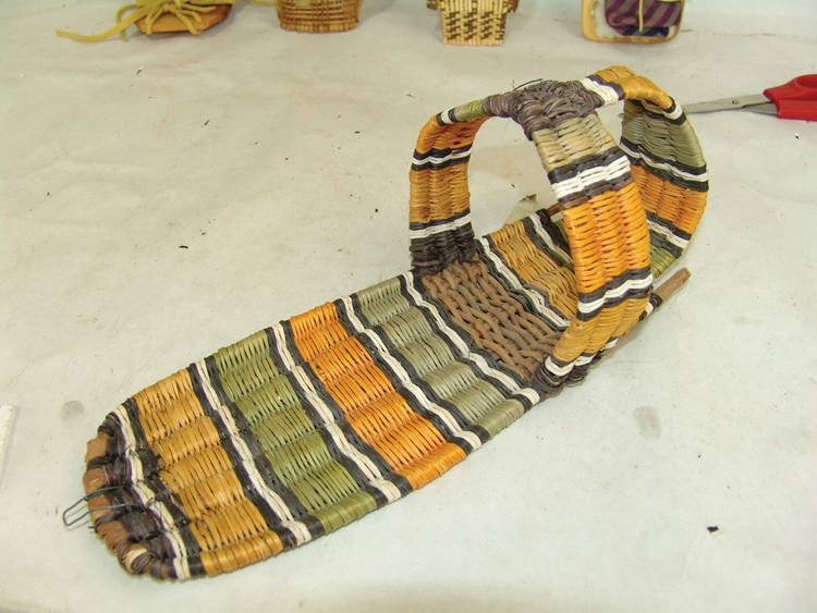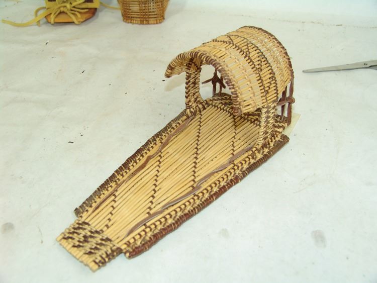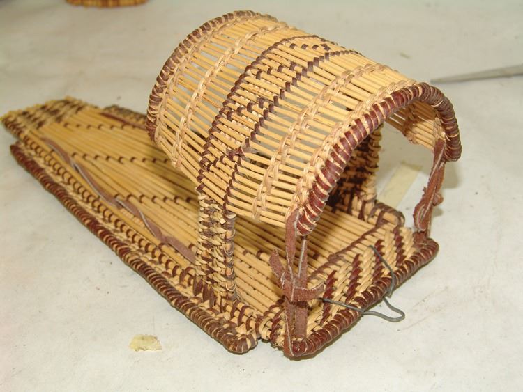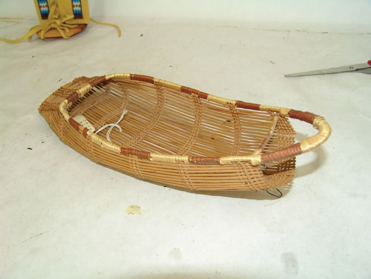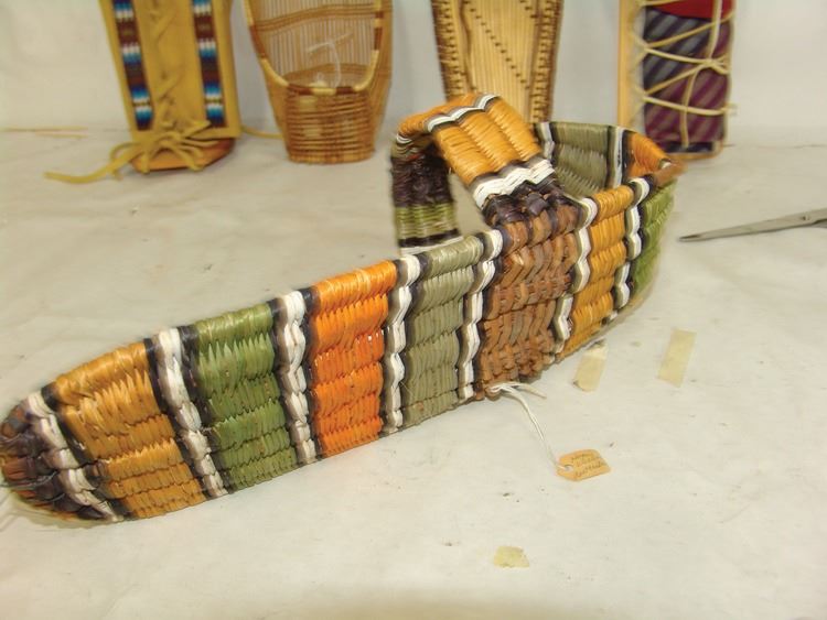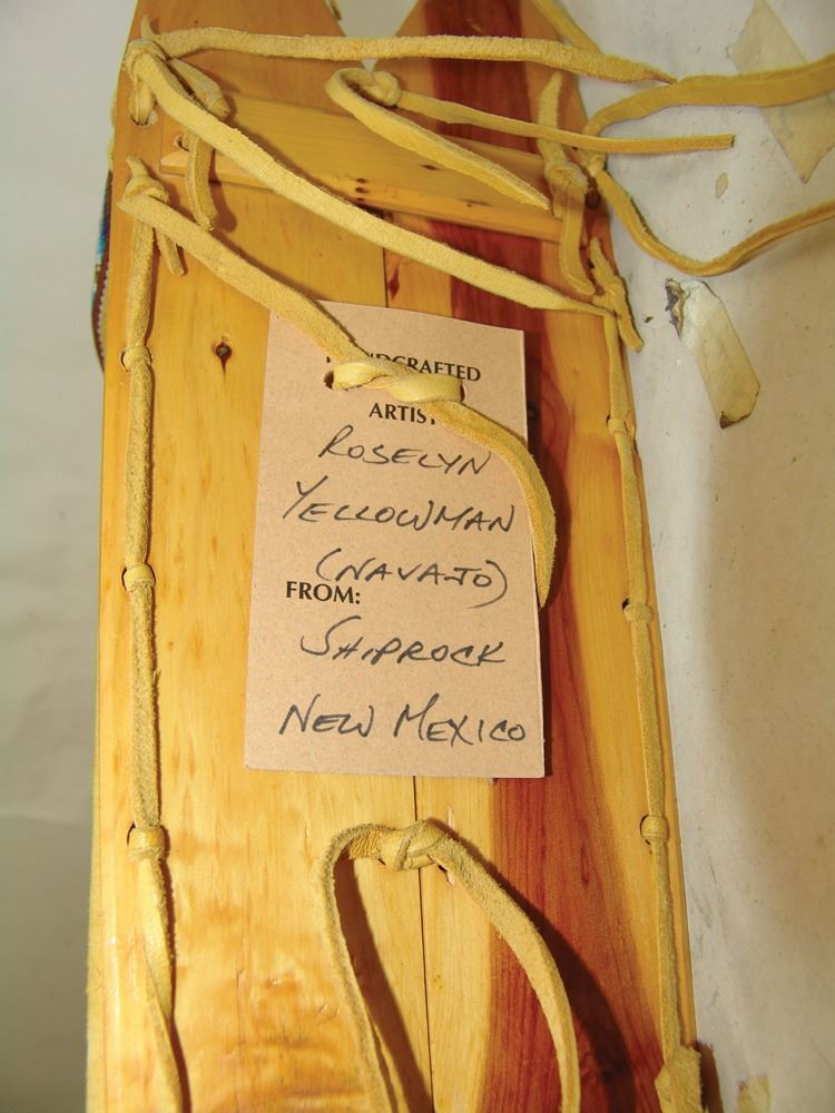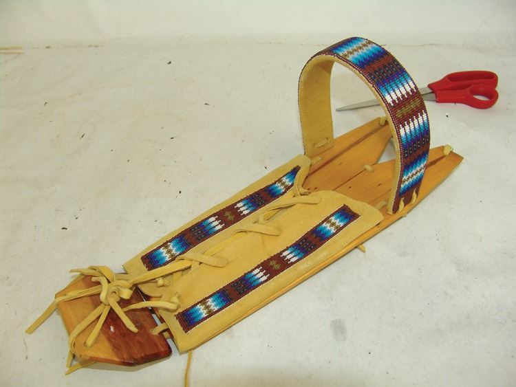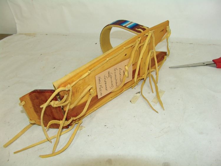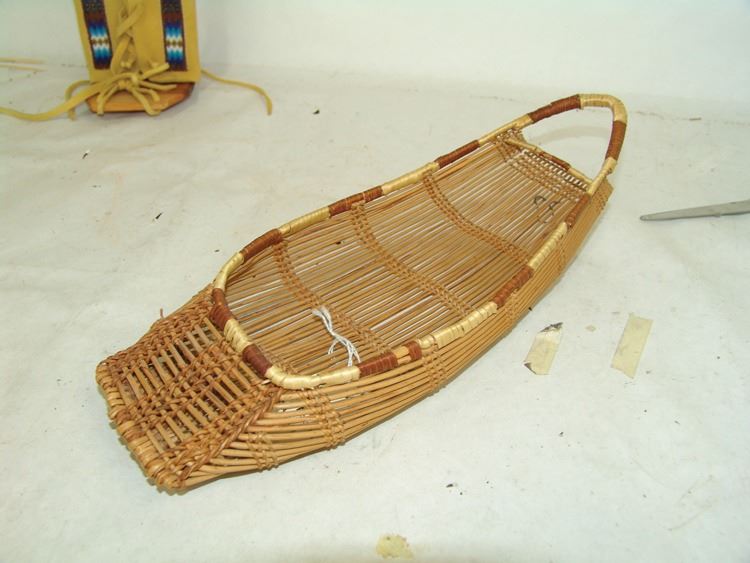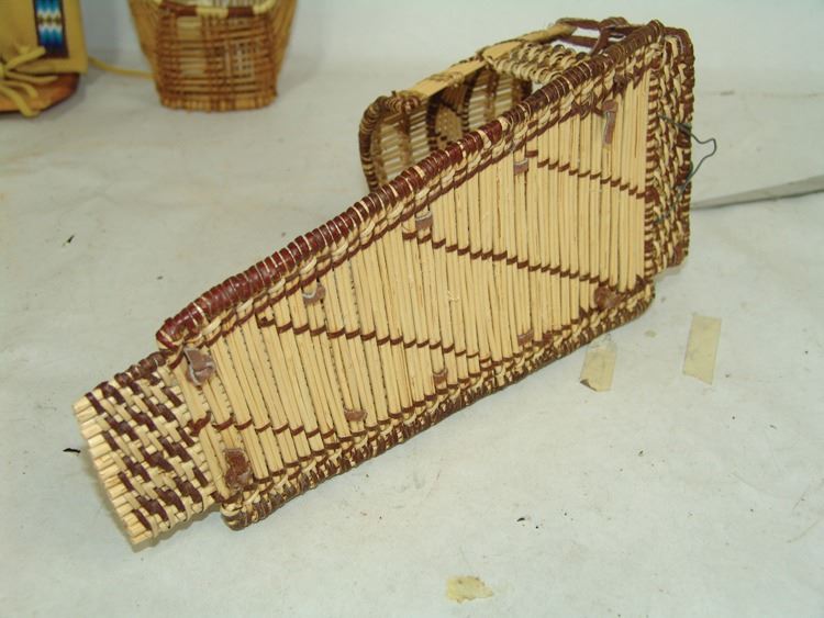 Fantastic Display of 9 toy baby carriers woven out of basketry including Papago, Hopi, and Mono examples (all with dolls), one fine Hopi, Paiute, and Hupa versions, plus three cloth and board examples, one beaded, one Juniper, one a,Ca. 1940s-1980s,Largest 12".