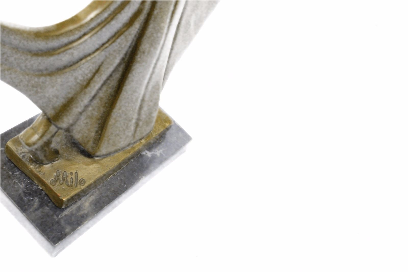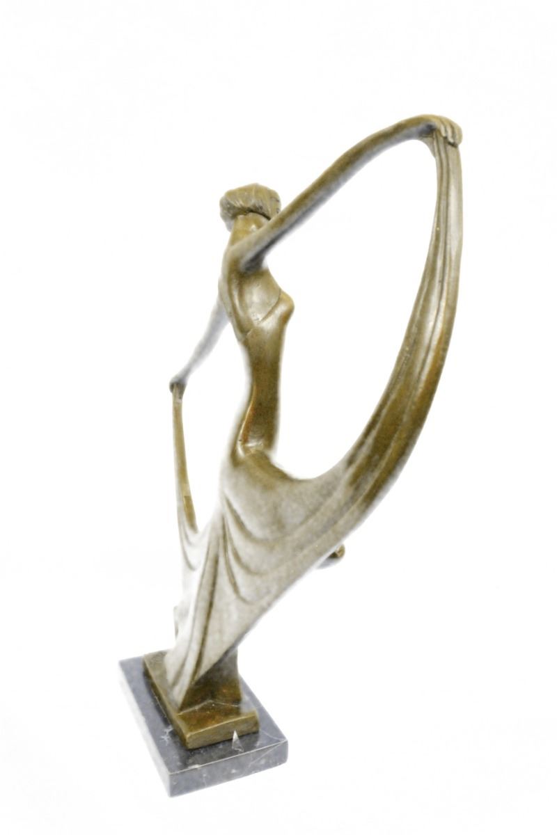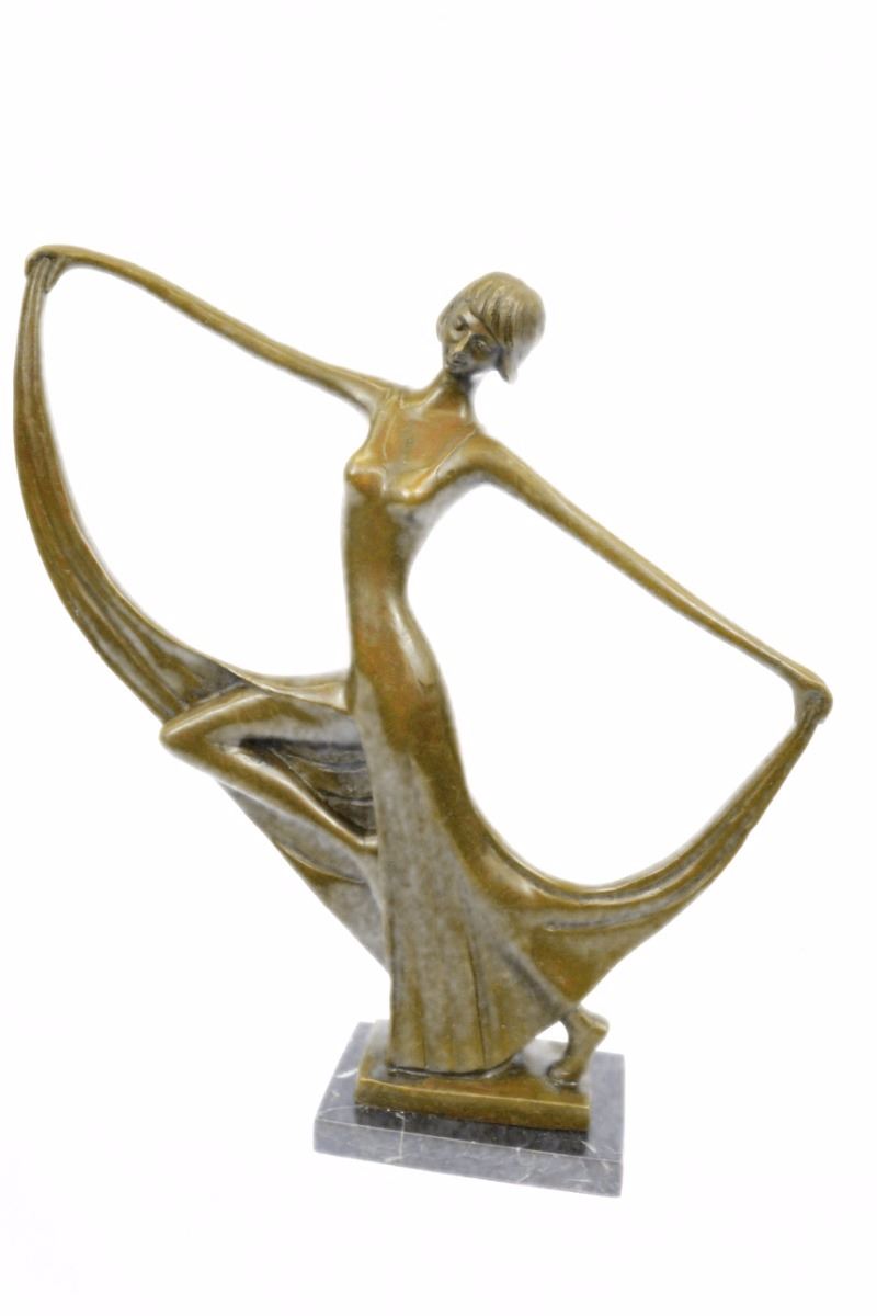 The Lean And Elegant Figurine Is Captured In Mid-Dance. Her 2-Dimensional Appearance Seems As Though She Was Removed From A Wall Carving Creating An Interesting Abstract Illusion. She Fans Out The Garments Of Her Ankle-Length Dress Amplifying The Motion Of Her Dance.Her Right Knee Bends Peaking Out Of The Slit In Her Dress. She Closes Her Eyes With The Emotion Of Her Dance As She Serenely Smiles. The Dancer Was Cast Using The Age-Old Technique Of Lost-Wax Casting. She Is Stained In A Brown Patina And Mounted Upon A Black Marble Base. Bronze Dimensions With Marble Base: Height 13 X Width 12 inches. Weight: 8 Lbs.