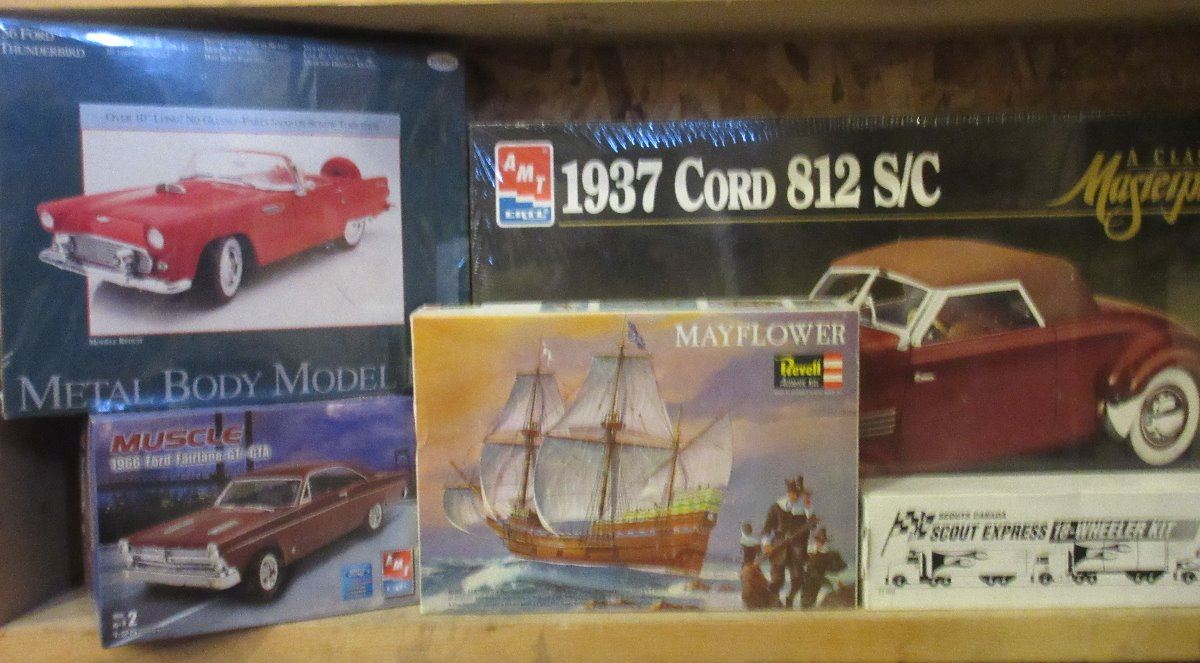 5 Unopened : Mayflower ship, 1937 Cord 812S C, Metal Body thunderbird, 1956 Ford Fairlane GTA, Scout Express 18Wheeler
