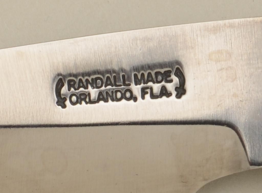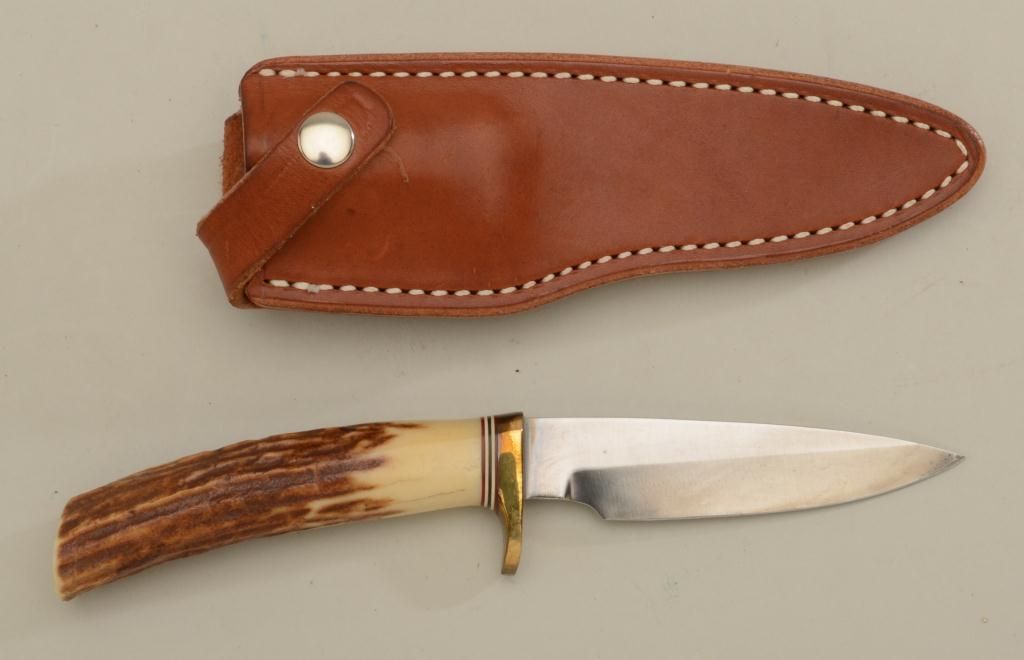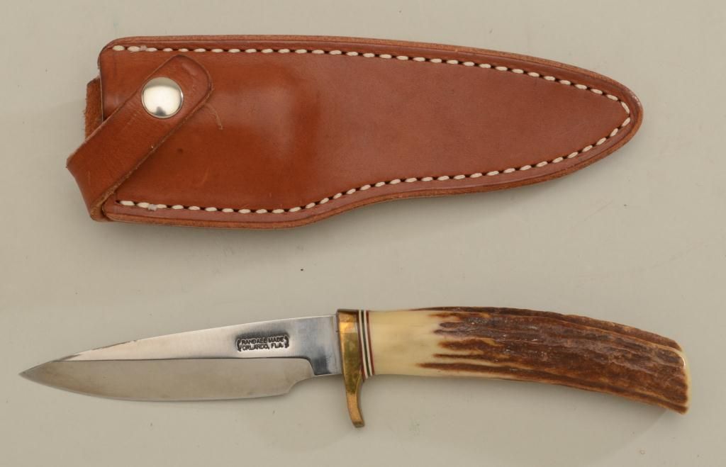 Model P Randall knife and Randall marked leather sheath (Orlando, FLA); knife is approx. 8-1/2” overall with an approx. 4” blade in fine condition and with a beautiful stag grip. Est.: $350-$700.