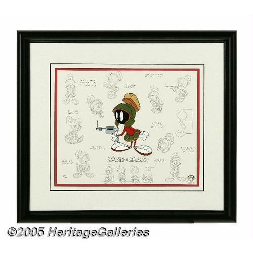 <B>Model Sheet: Marvin the Martian Limited Edition Hand-Painted Cel #187/750 (Warner Bros., 1996).</B></I> In 1948, Chuck Jones directed the classic Looney Tunes cartoon, ""Haredevil Hare,"" which introduced this world to that intrepid space traveler Marvin the Martian. This hand-painted limited edition animation cel was produced by Warner Bros. Animation Art using the same methods employed in preparing cels for actual production. The background drawings were adapted from an original Marvin the martian model sheet from Warner Bros. Classic Animation, and special attention was paid in the printing in order to capture the delicate line quality. This art measures 16"" x 13,"" and is in Excellent condition. Includes a certificate of authenticity. <BR><BR><B>Important notice:</B> Heritage usually auctions material at the rate of 200-250 lots per hour. On some occasions eBay Live bid software or the Internet may not be able to keep up with the pace of the auction. We recommend placing a realistic absentee bid now as insurance to avoid disappointment. Occasionally the auctioneer may eliminate or reject an eBay Live bid, and the auctioneer may also reopen a lot after the close of the eBay live bidding (usually because we missed an audience bid), and may reject your bid even if it shows you as the winning bidder. By bidding via eBay Live, you agree that Heritage may award the lot to another bidder at its sole discretion under the circumstances described above or any other reasonable circumstances. Since eBay bids are not shown to us until we open the lot on the floor, we treat those bids just like floor bids. In most cases the floor responds before the eBay bid is presented to us, due to Internet lag time, so for consistency we have made it a policy that floor bids are always considered first over tie eBay live bids. Also please note that all Heritage lots purchased through eBay Live carry a 20% Buyer's Premium. Please make sure you read the Terms and Conditions before you b