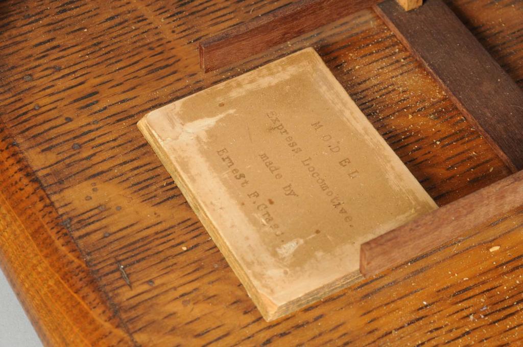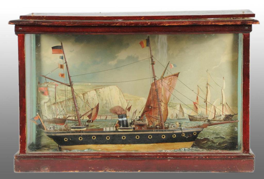 Very old sailboat model. Interior has hand-carved water made of wood. Boat is made of wood and rear lithographed scene is made of paper. Shows some age wear and needs cleaning. Overall very good to excellent condition. Size 21" x 14" x 8".